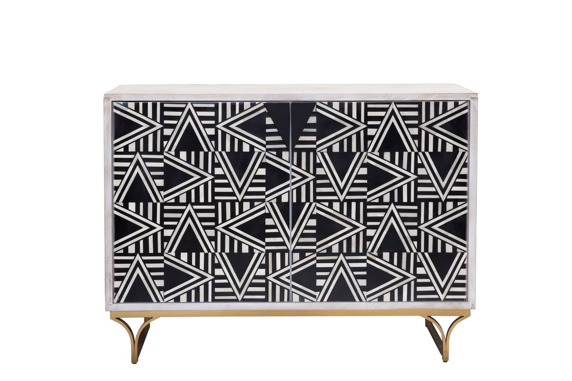 - Crafted with precision, its exterior features an appealing whitewash finish and striking geometric patterns on the cabinet doors, achieved through the artful use of bone and resin inlays