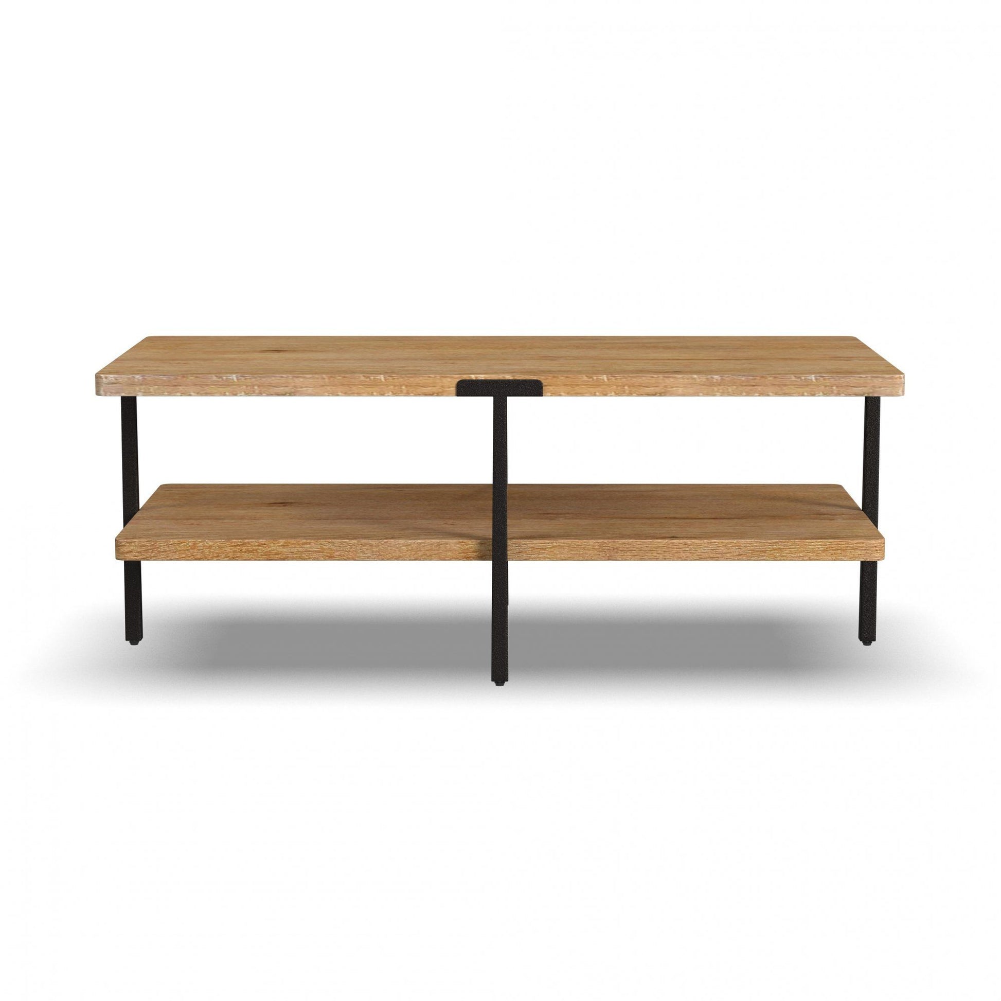 Sophistication meets rustic, industrial charm with the Millwork rectangular coffee table. Seamlessly blending high-contrast materials and finishes in perfect harmony, this table makes a captivating statement in any living space. A textured steel frame is highlighted by warm copper undertones, while a distinctive wood top and lower shelf exude character with natural knots, subtle saw marks and a white cerused finish that accentuates the rich umber wood grain.