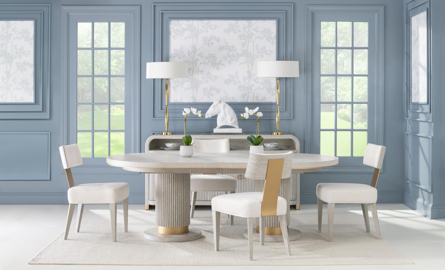 Approachable glamour. That's the look of the Miramar Total Home Collection from Legacy Classic - Modern. The collection features and acrylic accents bold fluting detail and waterfall edges. The accent finish is used in banding on case bases and foot rails table bases and on the posters of the Canopy Bed and low-post bed.