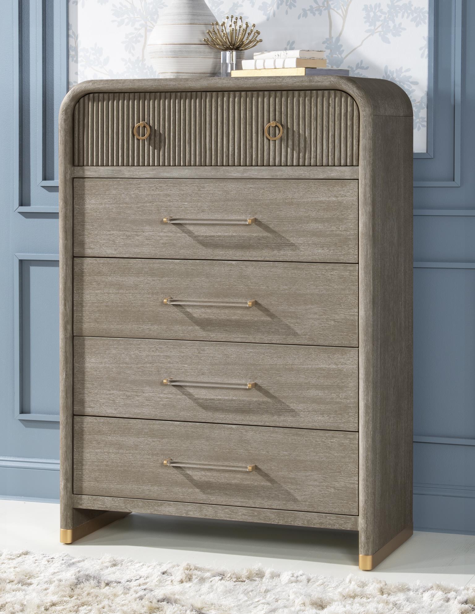 Approachable glamour. That's the look of the Miramar Total Home Collection from Legacy Classic - Modern. The collection features and acrylic accents bold fluting detail and waterfall edges. The accent finish is used in banding on case bases and foot rails table bases and on the posters of the Canopy Bed and low-post bed.
