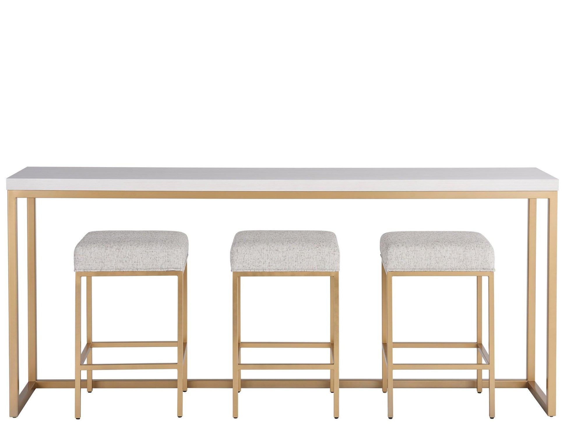 The Love Joy Bliss Console Table features a smooth tabletop in a chic Alabaster finish, which is accented by a soft gold metal base. Adding to its charm, this console table includes three upholstered accent stools, bringing additional comfort and convenience to spaces.