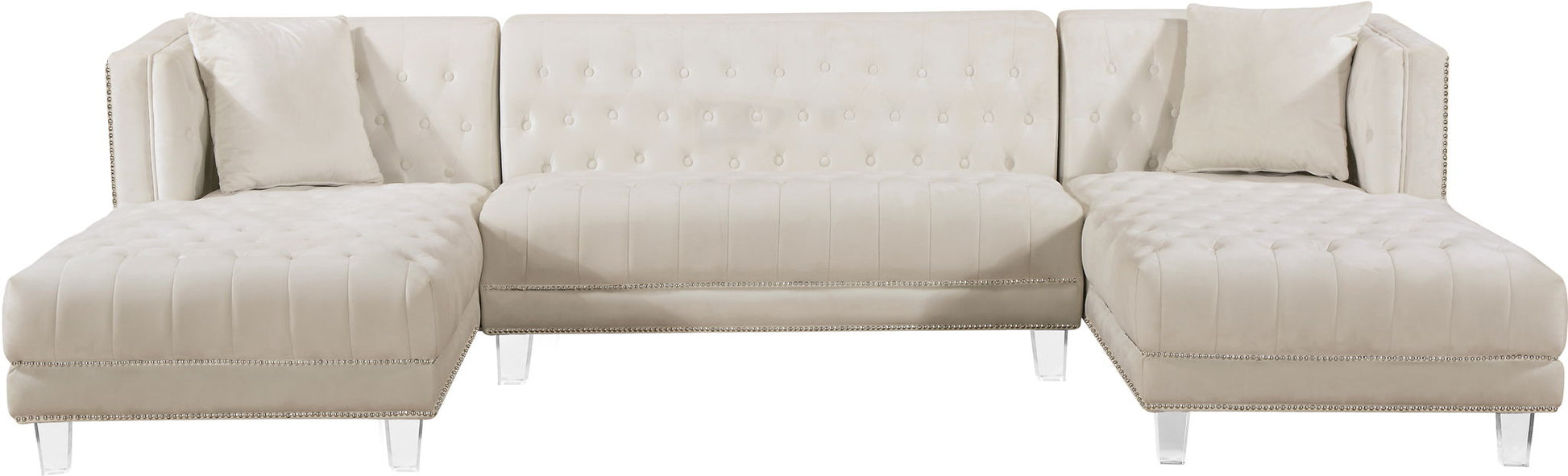 Grab a friend and get comfortable on this beautiful Moda velvet sectional sofa. This astounding sectional epitomizes luxurious living and features lots of room for the whole gang to get comfortable. Double chaise lounges on each end gives you space for stretching out for a quick cat nap, while deep tufting adds to the luxurious appeal of this unit. Acrylic lucite legs and a sturdy frame make this sectional a durable addition to your living room or den, while the included pillows give a homey slant to an otherwise uber contemporary sectional.