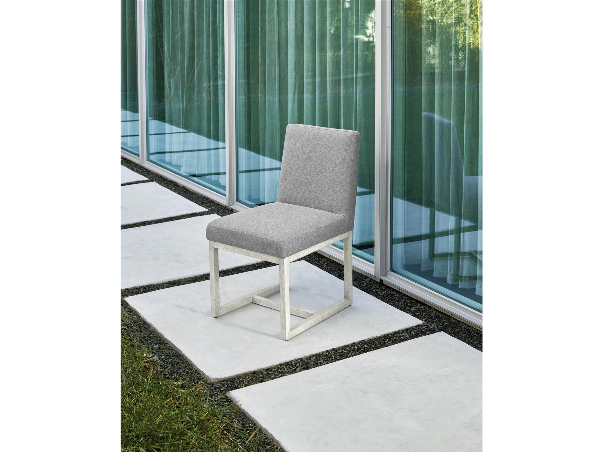 The plush upholstered seat of the Carter Side Chair rests atop its perfectly angular base, while its quaint fabric detailing adds a unique and unexpected touch.
