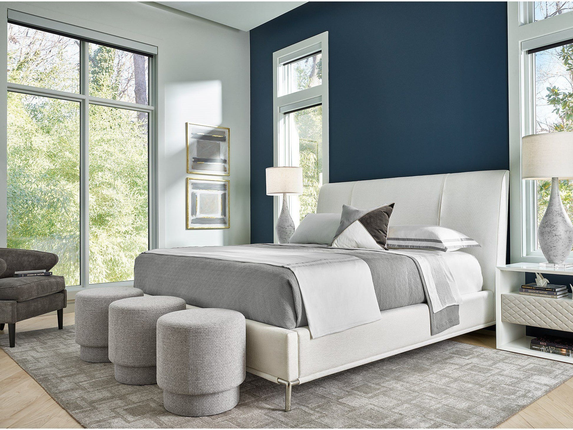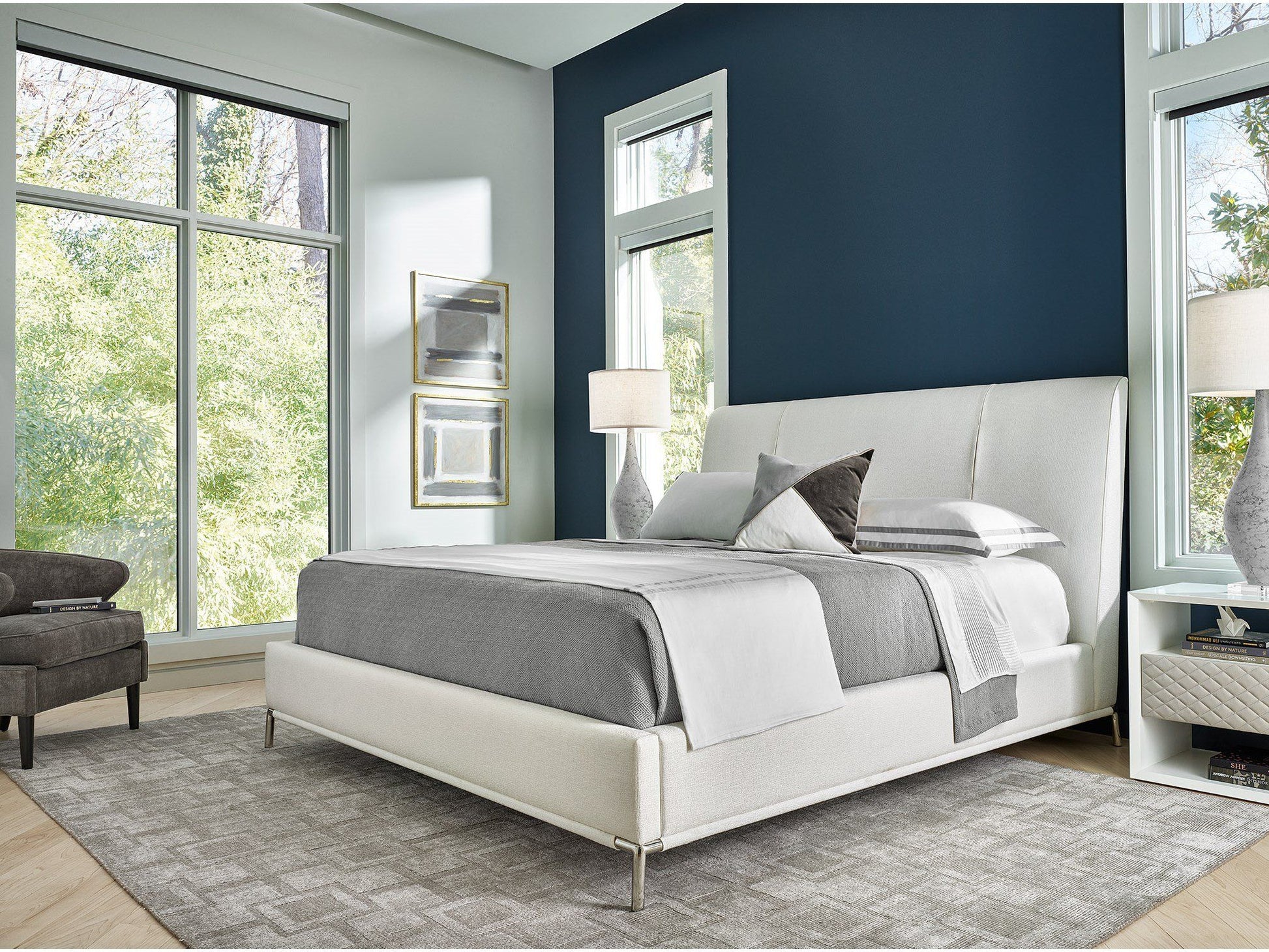 Radiating a plush opulence, the Conway Bed features a slightly curved silhouette in a clean white fabric and is finished with chic silver metal legs.