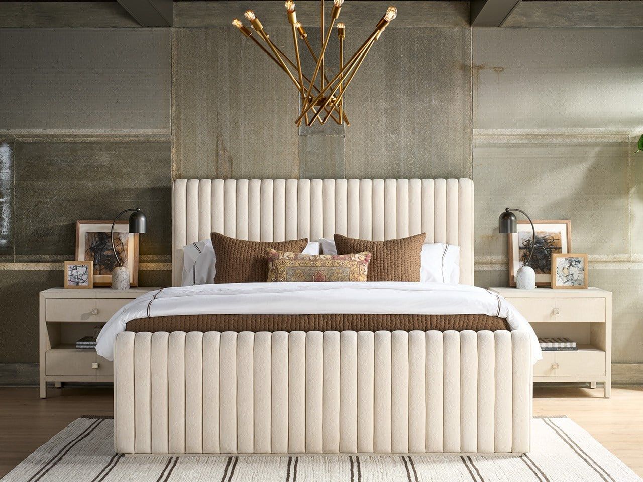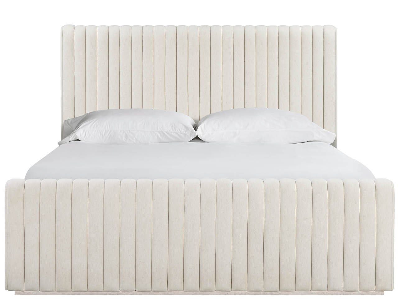 The vertical channeling of the Strata Bed creates an enveloping texture, offering a sanctuary of serene style in soft Levi Oyster fabric. This dramatic platform bed achieves quiet luxury by balancing the textile with a crisp, low-profile base in the light Mist finish.