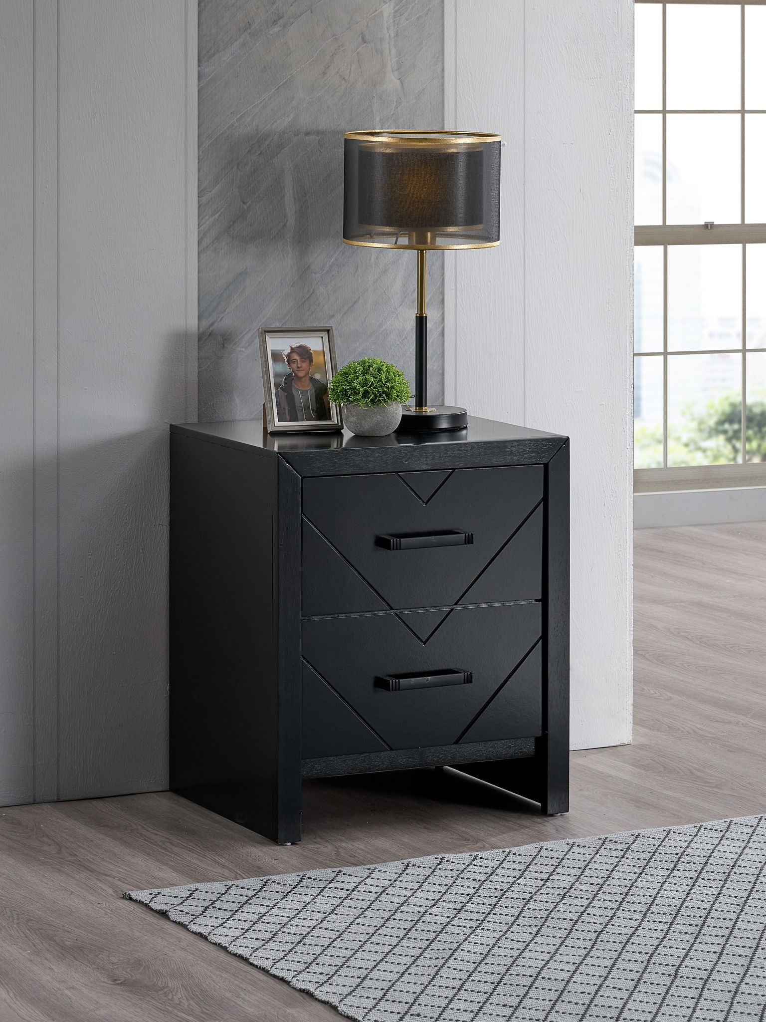 Expertly crafted from a combination of solid and manufactured wood, this fully assembled nightstand features a distinctive V-shaped embossing on the drawer fronts for added visual appeal. It includes two dovetailed drawers with center-mounted guides and safety stops for smooth, secure operation. Black removable handles offer a customizable touch, making this piece both functional and stylish—perfect for any bedroom setting.