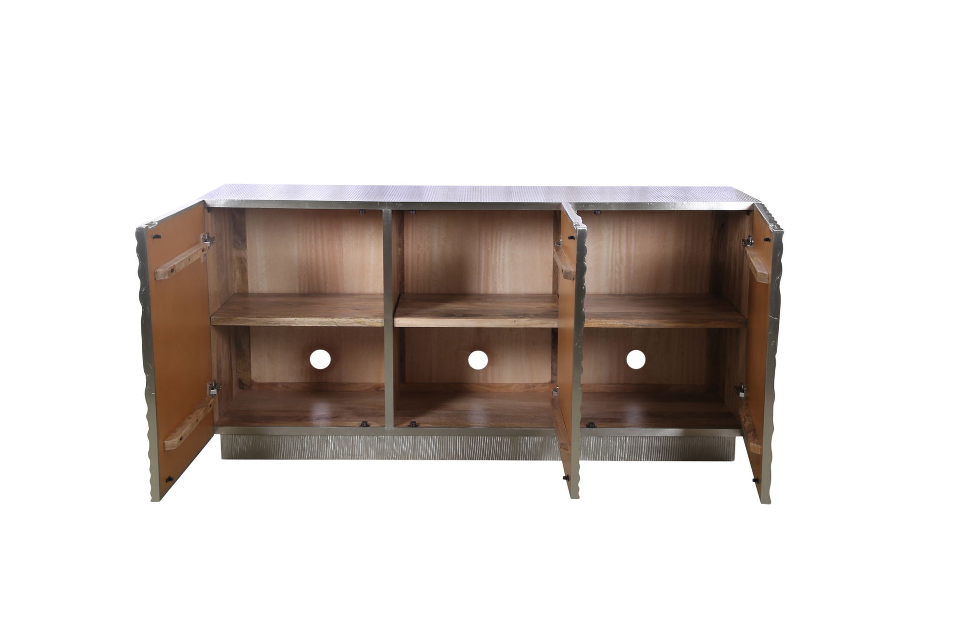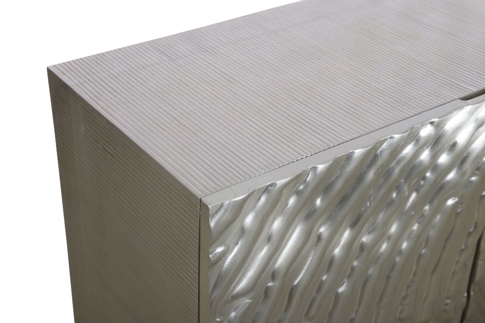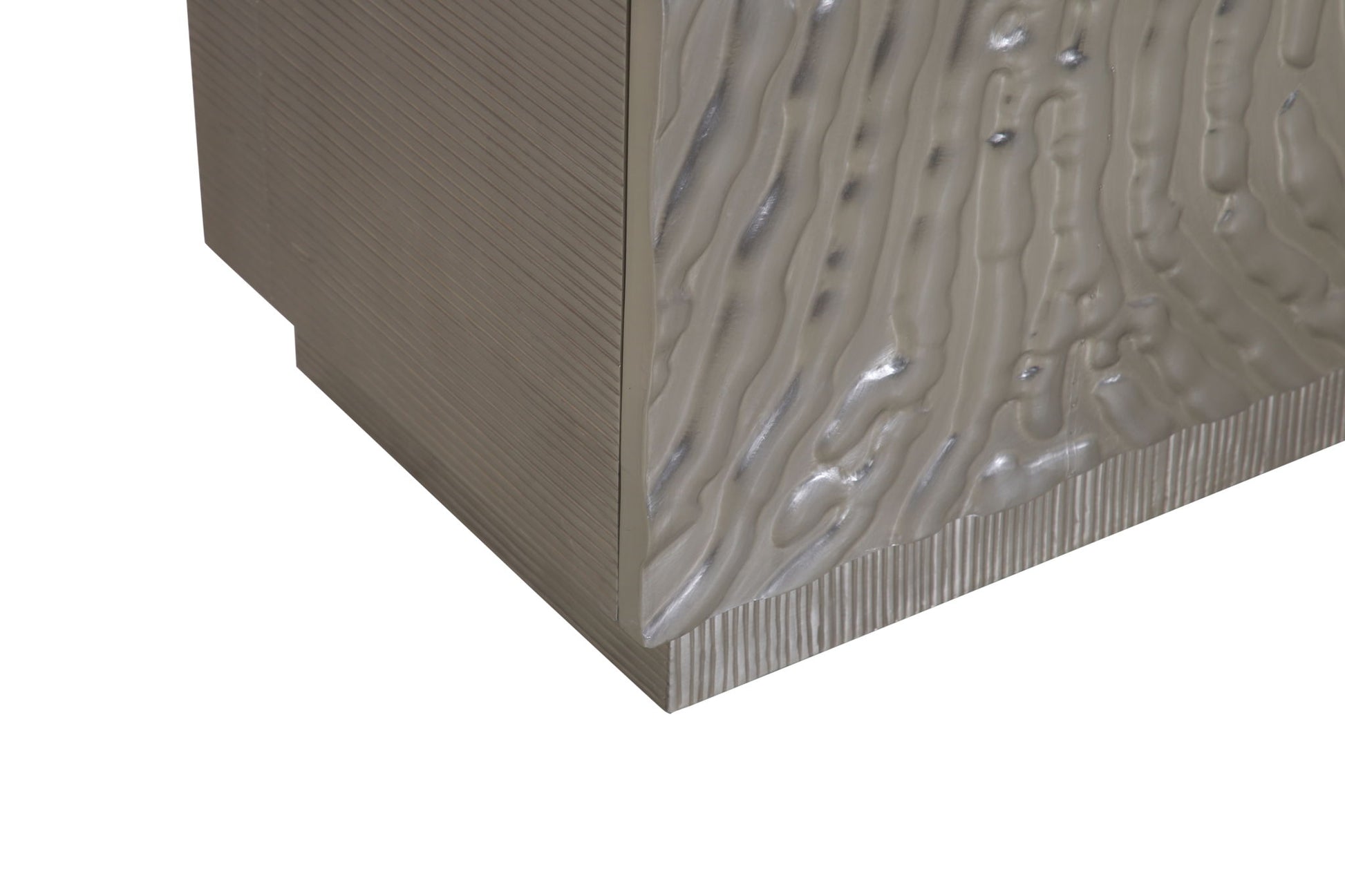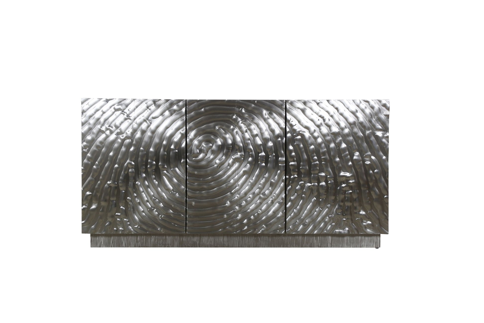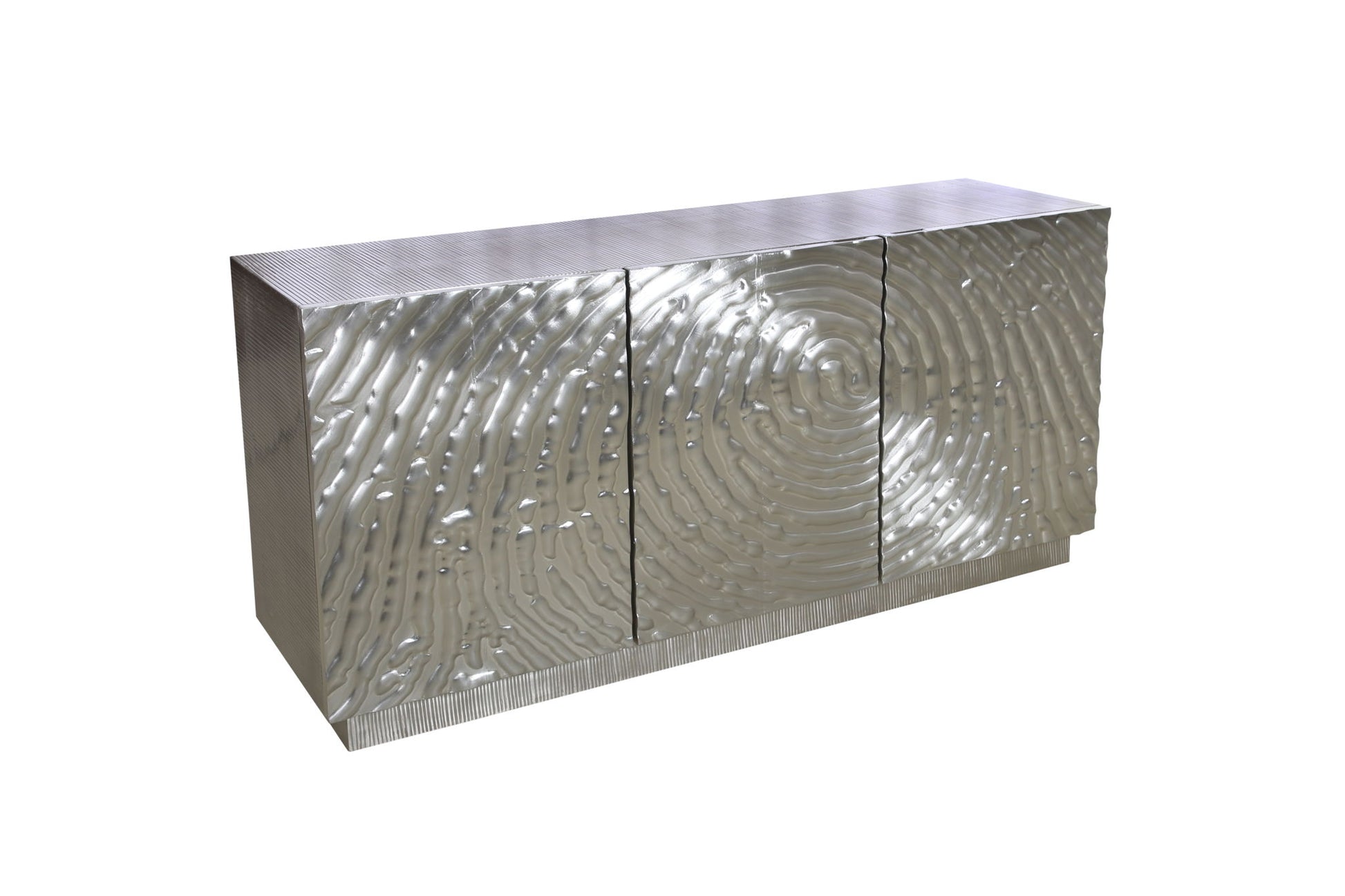 The Mugshot Server makes a bold, modern statement with its striking fingerprint inspired door design. Constructed from solid wood and wrapped in sleek aluminum, this piece is finished in a satin German silver finish, exuding sophistication and contemporary flair. The unique fingerprint door detail adds an eye catching, artistic element to the design, making it a focal point in any room. Inside, the three doors open to reveal fixed shelving and convenient media cord management, ensuring both style and functionality are seamlessly combined. Perfect for modern living spaces, this server offers practical storage with undeniable style.