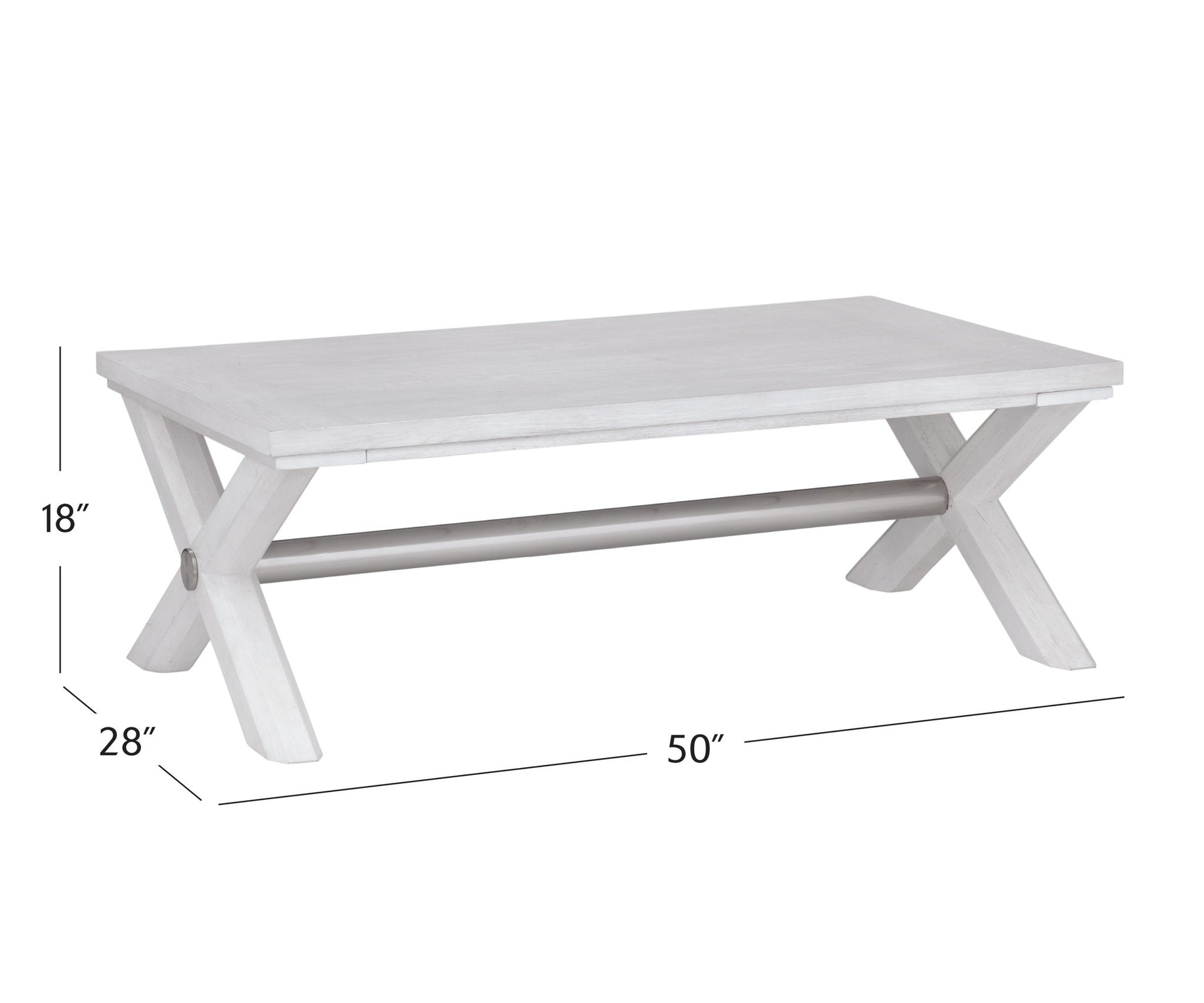 The Nadine Cocktail Table features a coastal contemporary inspired design that is constructed with solid wood and veneers in a bright white oak finish the table base features a heavy octagonal shaped X-base and a brushed nickel finished metal cross-bar. Finish: bright white, brushed nickel. Material: solid wood, wood veneers, metal..