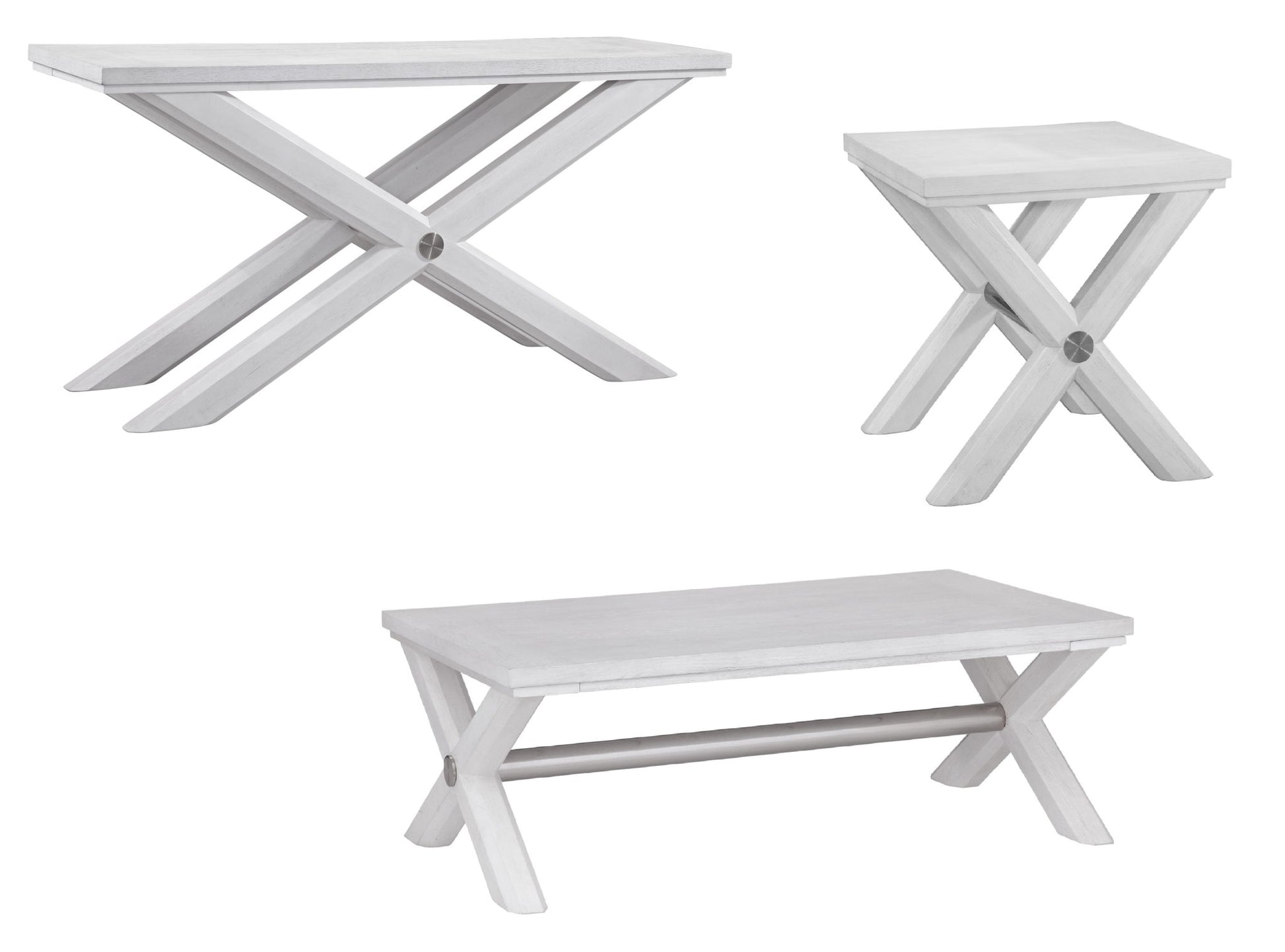 The Nadine End Table features a coastal contemporary inspired design constructed with solid wood and veneers in a bright white oak finish. The table base features a heavy octagonal shaped X-base and a brushed nickel finished metal cross-bar. Finish: bright white, brushed nickle. Material: solid wood, wood veneers, metal..