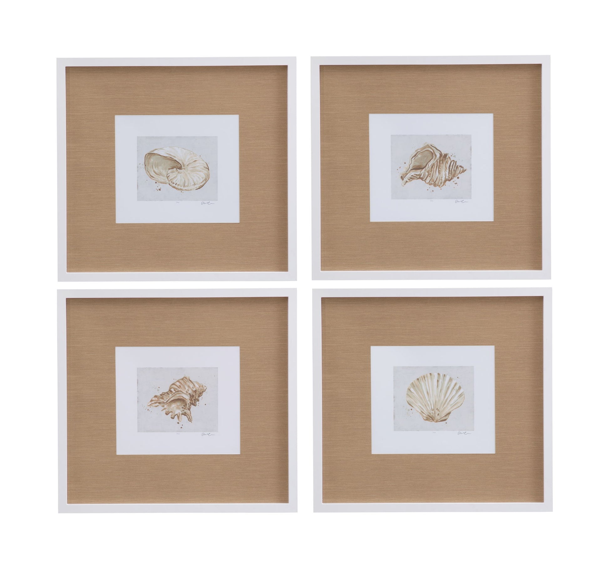Neutral Shell Fresco IV is a limited edition print, signed and numbered by the artist and printed on fine art cotton rag paper. The print is framed in a matte white frame with a textured tan mat board.