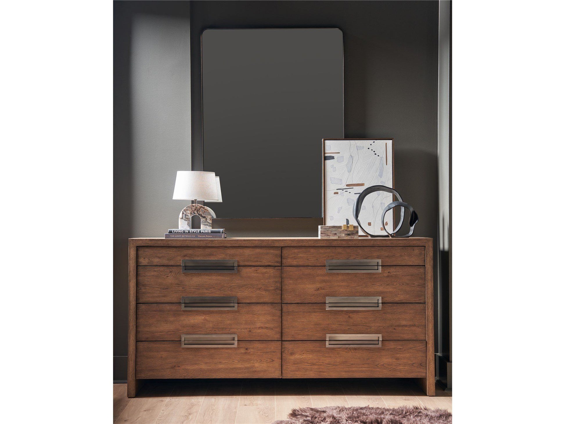 The Atlas Drawer Dresser presents a commanding presence with its eight drawers, finished in a medium Brown Oak. The design is distinguished by dark centered pulls, offering an astute and robust character that effortlessly anchors any room with a sense of refined strength and sophistication.