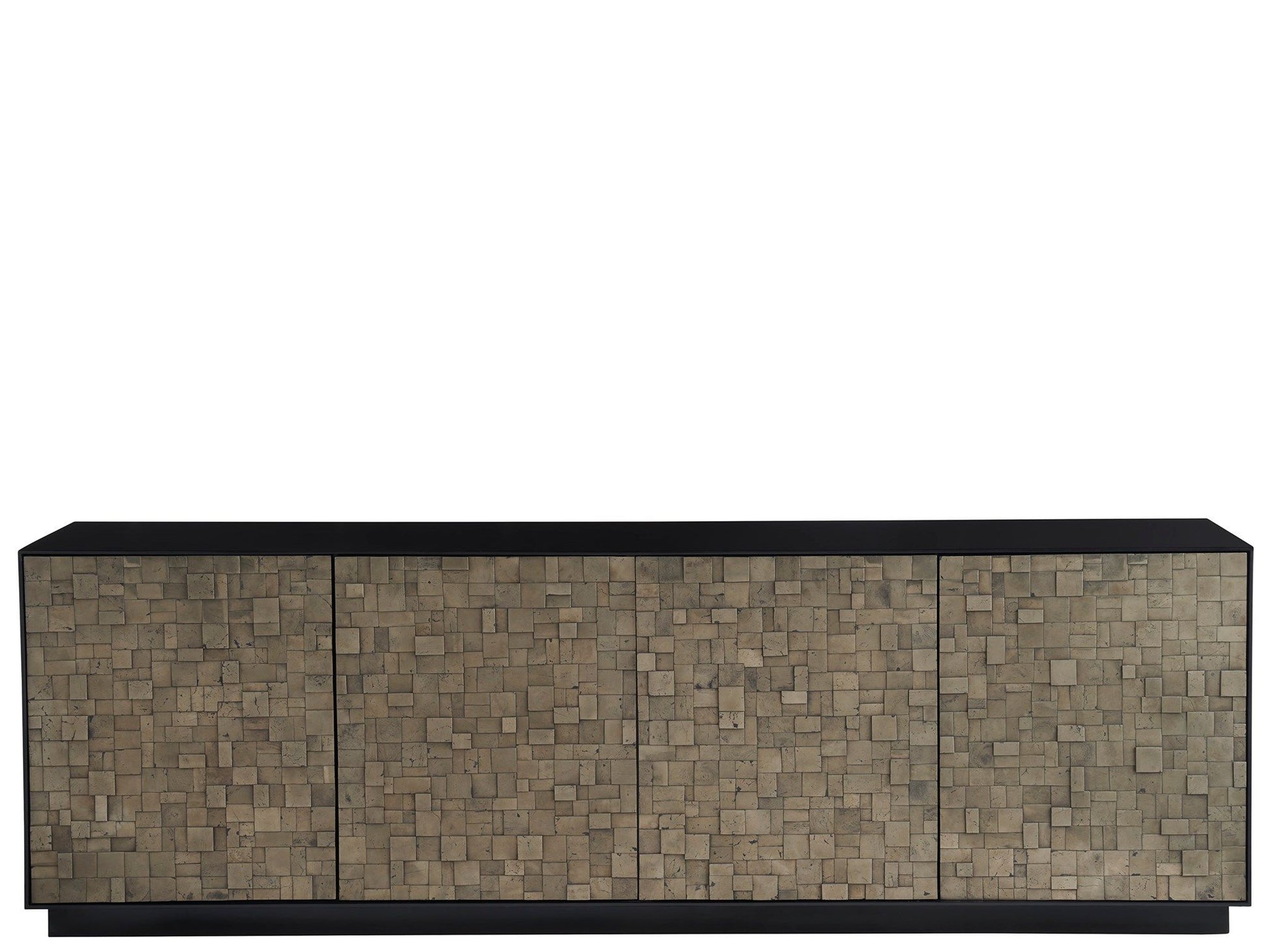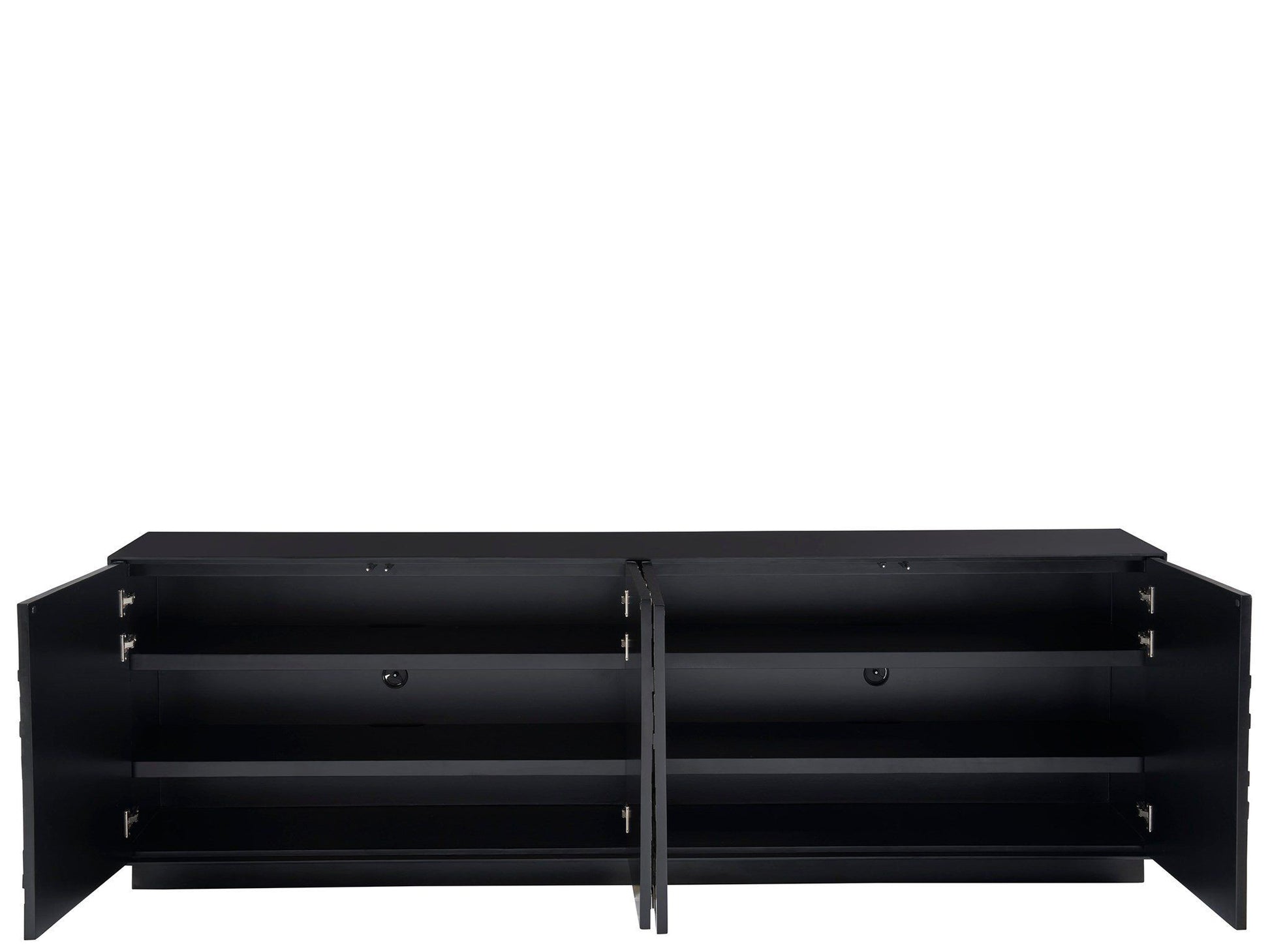 The Cosmo Credenza, crafted in Pyrite and finished in Matte Black, showcases a striking facade with its four doors, reminiscent of a sophisticated mosaic. This piece exudes confidence through its bold hues and defined silhouette, making it a statement of artistry and elegance in any space it adorns.