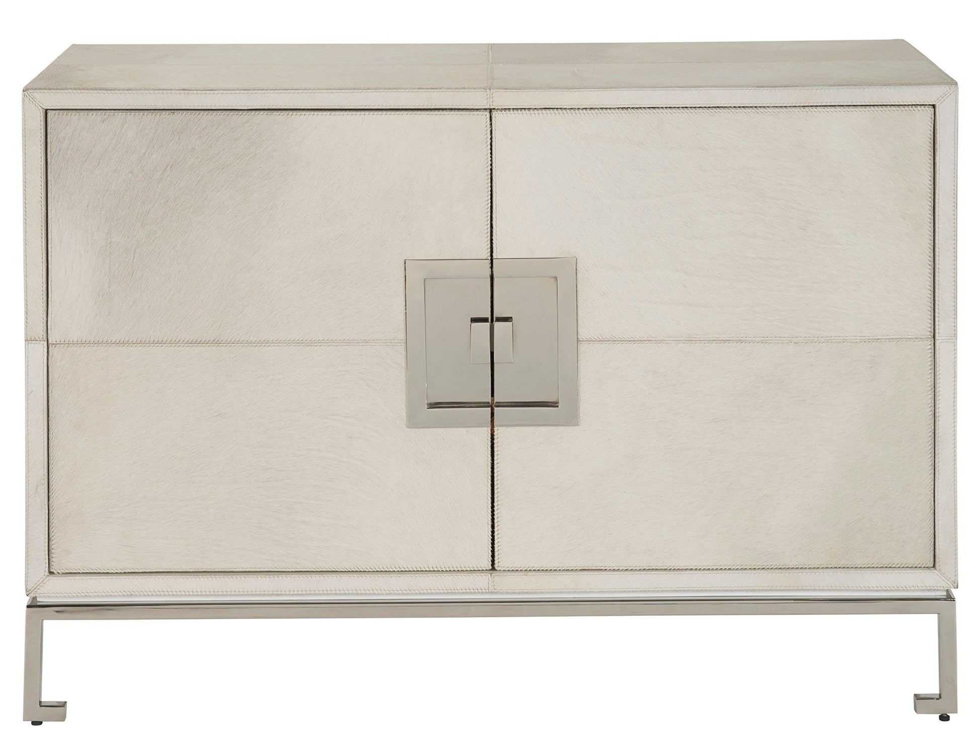 The Marigold Door Cabinet, enveloped in Grey Hair on Hide and accented with Polished Nickel, exudes an air of opulence and grace. Its design is enhanced by subtle geometric details, adding an element of sophistication that elevates this piece to a level of refined luxury, perfect for spaces that embrace a touch of glamour.
