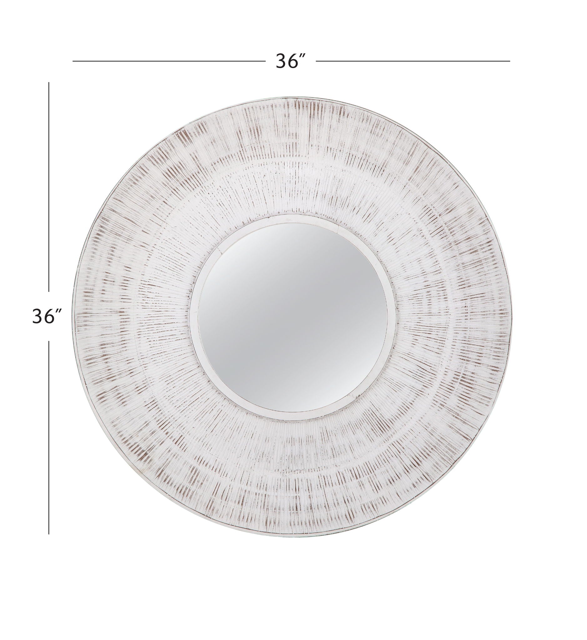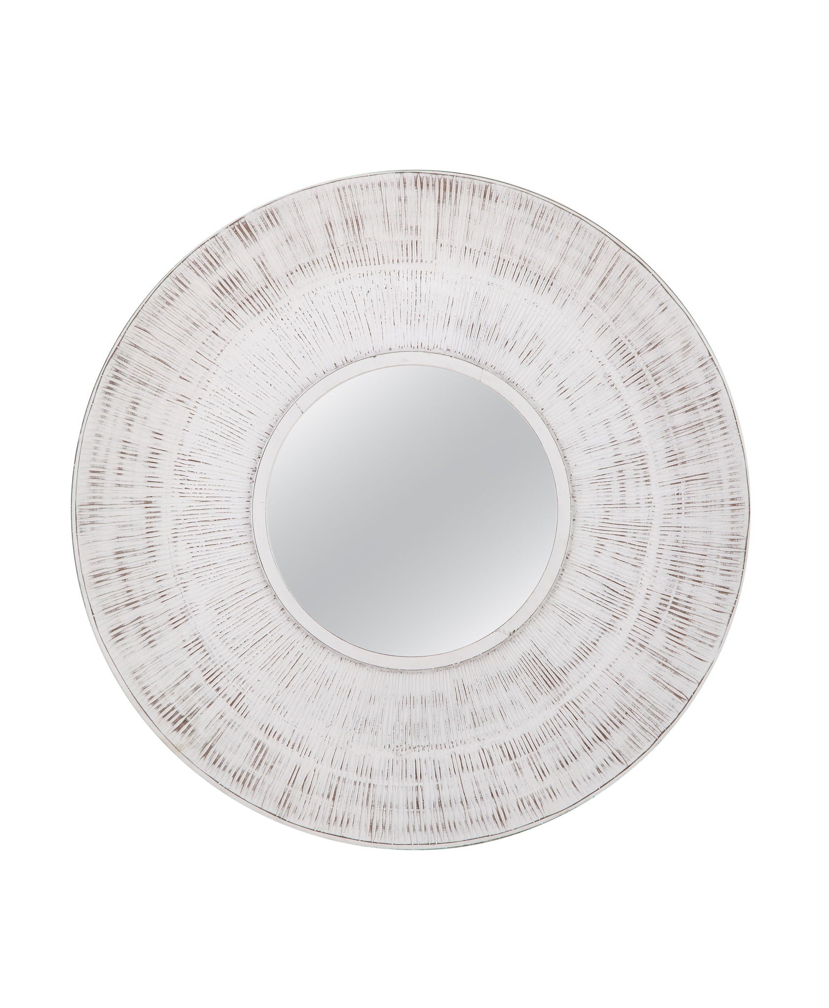 The Ocean Isle Wall Mirror showcases a round design encased in an oversized distressed white wood frame, blending modern and coastal styles effortlessly. Crafted with a distressed white finish, its coastal charm adds a touch of serenity to any space. Elevate your decor effortlessly with this stylish and versatile mirror.
