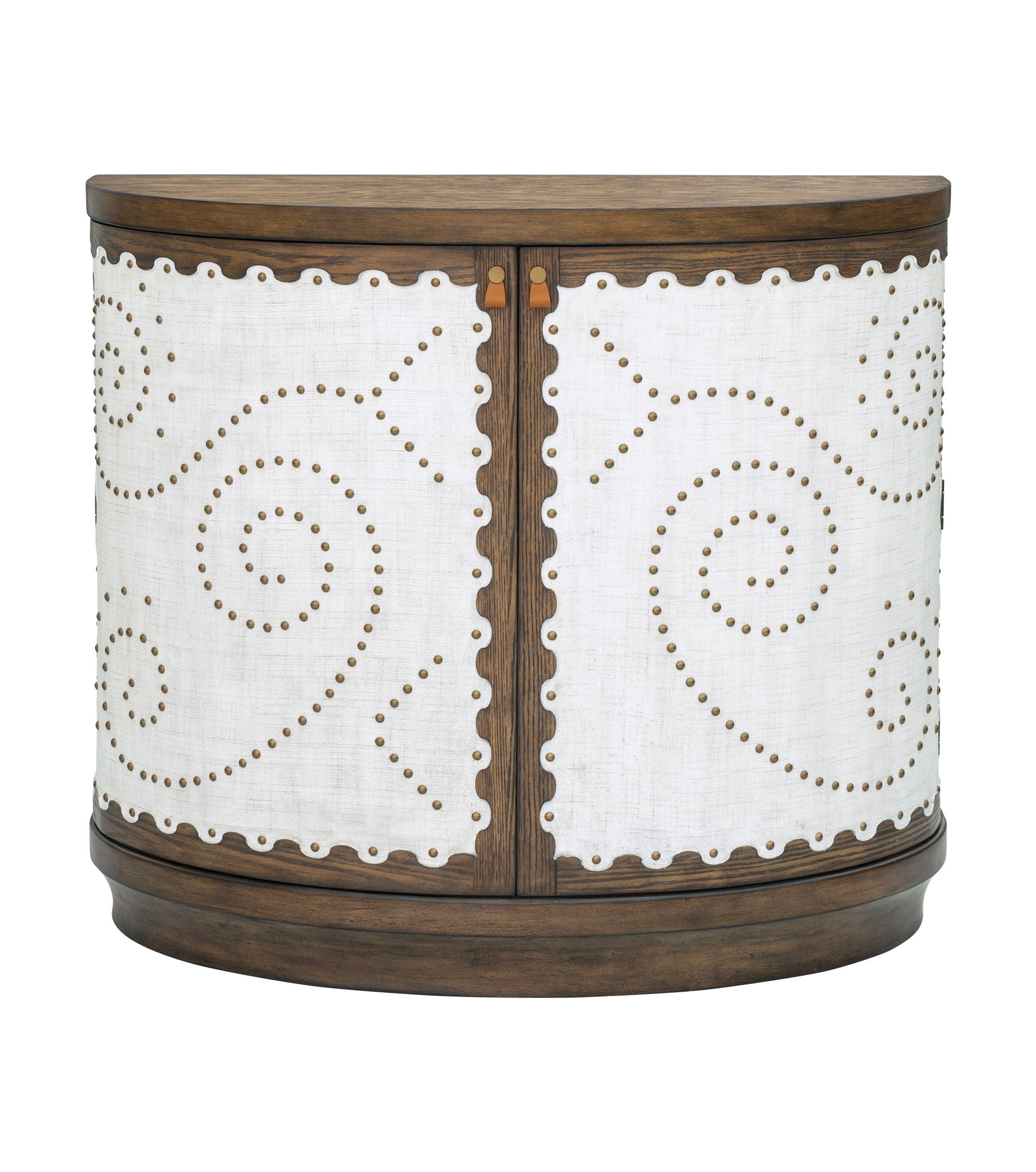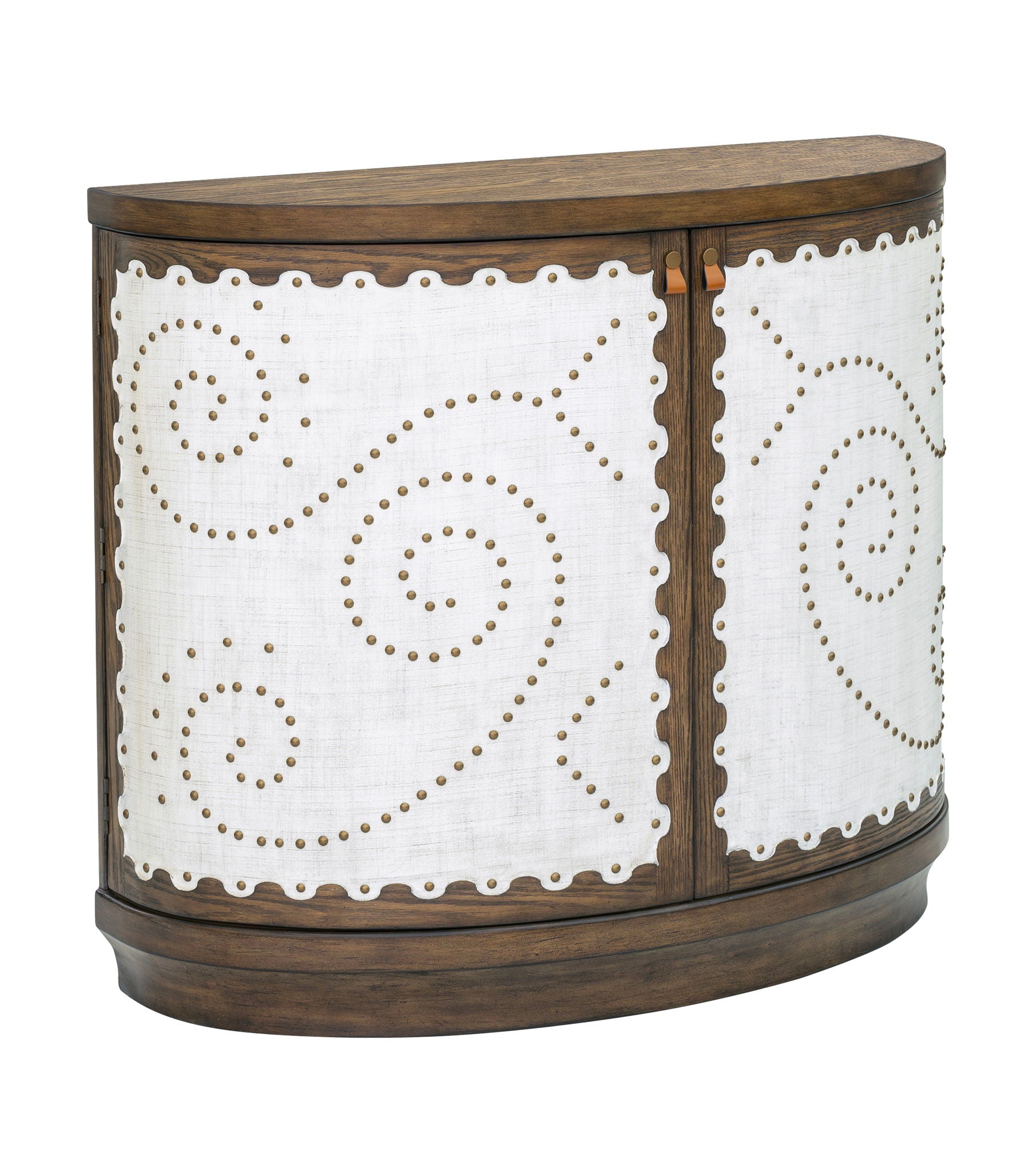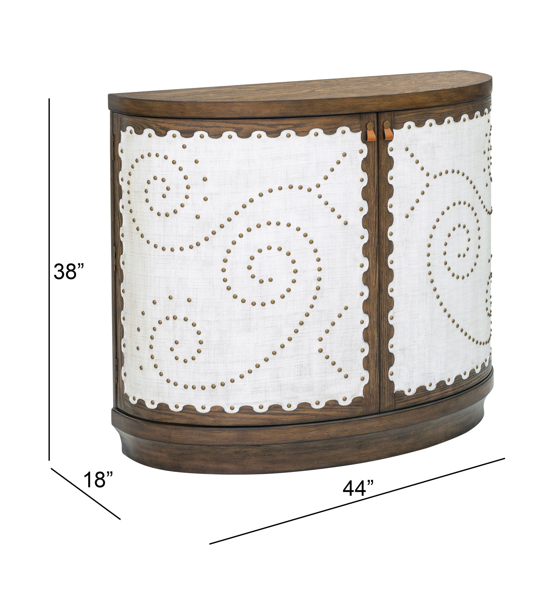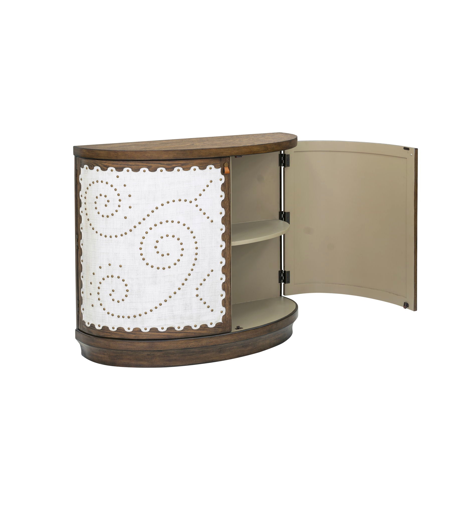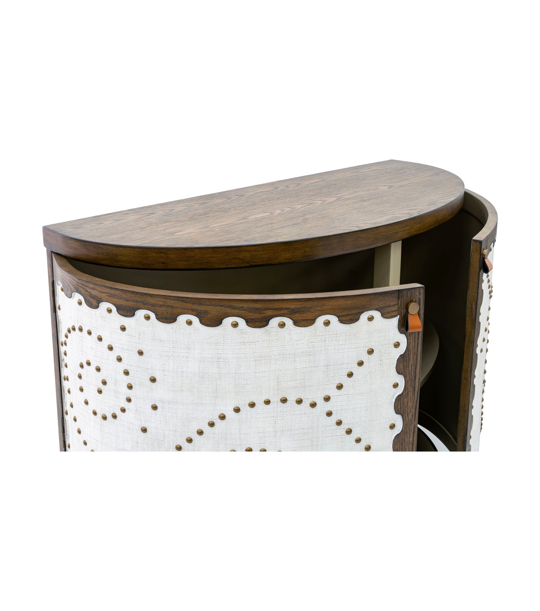 The Oxford Hall Chest blends neo-traditional design with a unique mix of materials and finishes. The demi-lune shaped case is crafted from solid wood and wire-brushed oak veneers in a warm chestnut finish, offering a rich and inviting look. The framed doors are wrapped in a neutral linen-like fabric, featuring a distinctive brass nail head pattern for added texture and detail. Leather-like pulls complete the look, and behind the doors, you'll find adjustable shelving for added versatility and function.