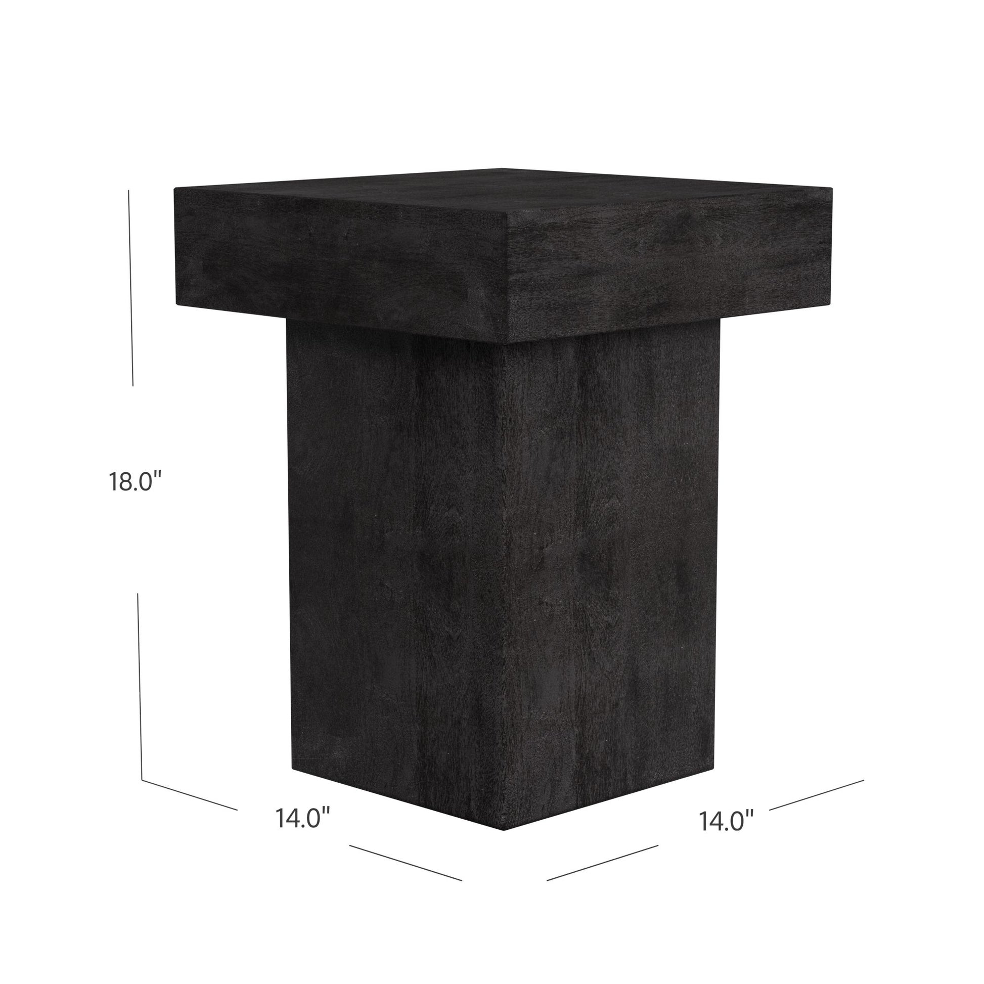 The Padula Small End Table exudes modern sophistication with its minimalist design and clean lines. Crafted from solid wood and mango veneers in a sleek matte black finish, this end table adds a touch of elegance to any space. Its matte black surface complements its sturdy construction, making it a stylish and functional addition to any space.