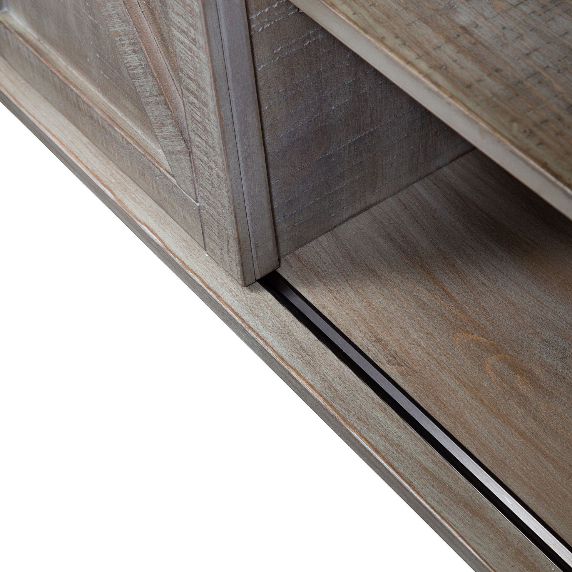 Accent your space with the contemporary Parkland Falls sofa table. Crafted of pine solids and knotty pine veneers, this piece features a weathered taupe finish with saw mark distressing, an appealing planked top, two full extension drawers with wood framed drawer fronts, four open shelves, two sliding doors with an adjustable center shelf for additional storage, wire management provisions, and is accented by pewter bar pull hardware. This piece is a great addition to any rustic, contemporary, or casual living space.