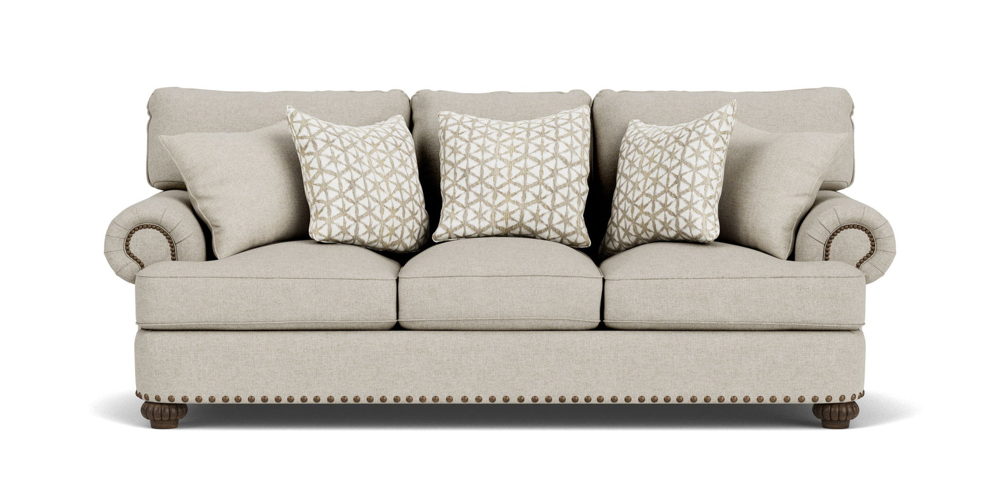 Generous proportions in an elegant design. Prominently rolled arms and a padded front rail give Patterson its welcoming appearance. Overstuffed seat and back cushions on a large frame make it difficult to resist curling up on this piece. Fluted bun feet and optional nailhead trim add the finishing touches to Patterson.