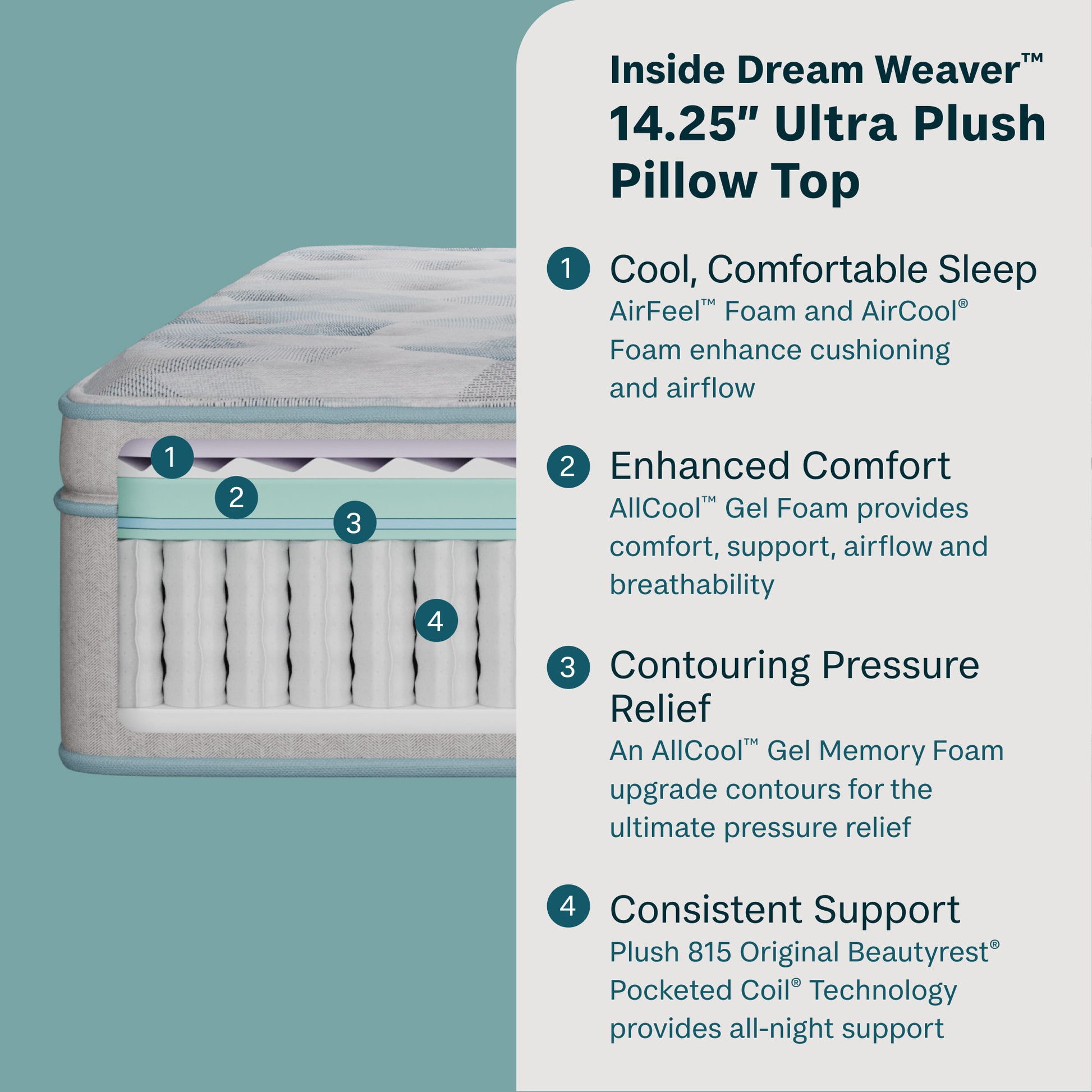 The Beauty Sleep® 14.25” Ultra Plush Pillow Top mattress is designed for your lifestyle. With a quilted pillow top, our Beauty Sleep® 14.25” Ultra Plush Pillow Top mattress features premium foams, including our AirCool® Foam with a channeled design for cushioned airflow plus AllCool™ Gel Memory Foam and AllCool™ GelFoam for contouring comfort, support, airflow, and breathability. Plus, Plush 815 Original Beautyrest® Pocketed Coils provide consistent, supportive sleep at a value designed for your lifestyle.