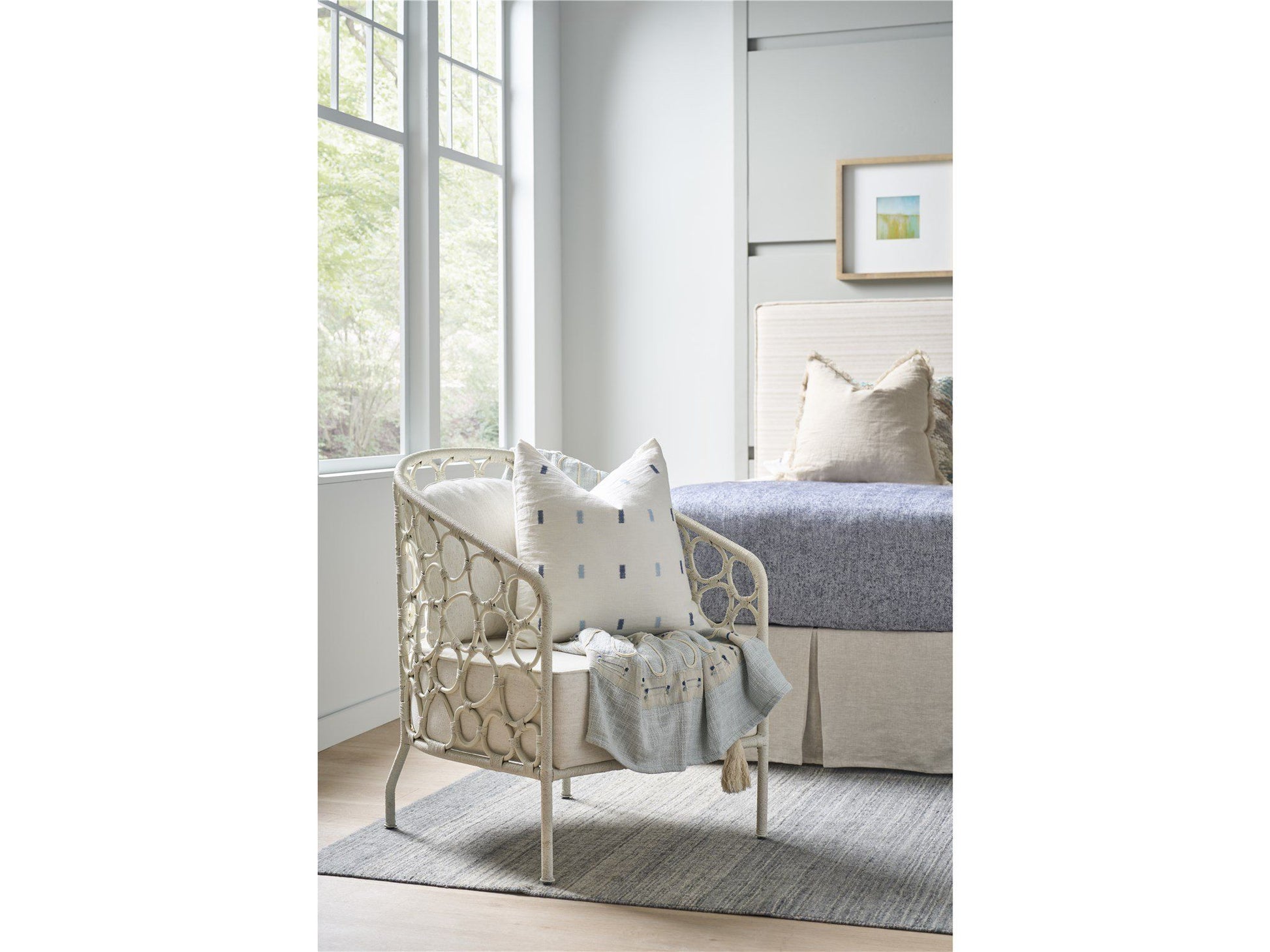 The Pebble Accent Chair features a carved white rattan frame with an organic pebble-like openwork pattern. This distinctive chair with Nomad Snow upholstery provides comfortable seating while the 33-inch height and 16-inch seat height create a striking occasional chair that embodies coastal whimsy.
