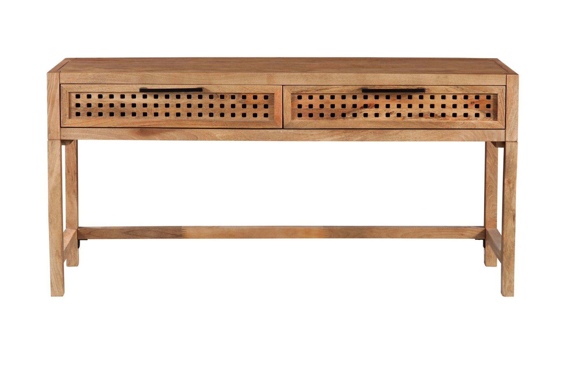 The Pentak Console Table features modern Bohemian styling with an industrial flair. Featuring two drawers accented with an open pierced fretwork detailing and matte black iron bar pull hardware. This console table is constructed with mango solids in a matte finish. Natural mango wood is a product of nature and is completely unique. The natural material is subject to variations in characteristics such as color, density, grain and finishing.