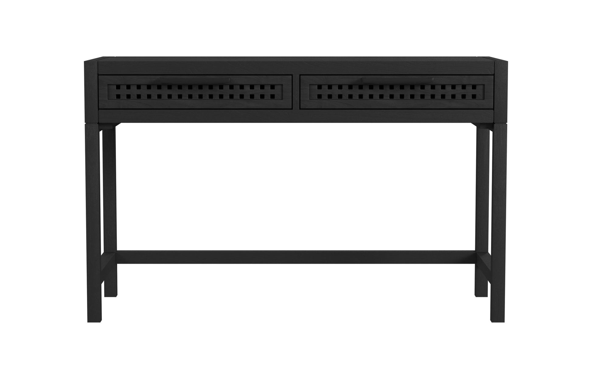 The Pentak Desk features modern Bohemian styling with an industrial flair. Featuring two drawers highlighted with open-pierced fretwork detailing and matte black iron bar pull hardware. This console table is constructed with mango solids a finished in a sand blasted, matte black. Natural mango wood is a product of nature and is completely unique. The natural material is subject to variations in characteristics such as color, density, grain and finishing.