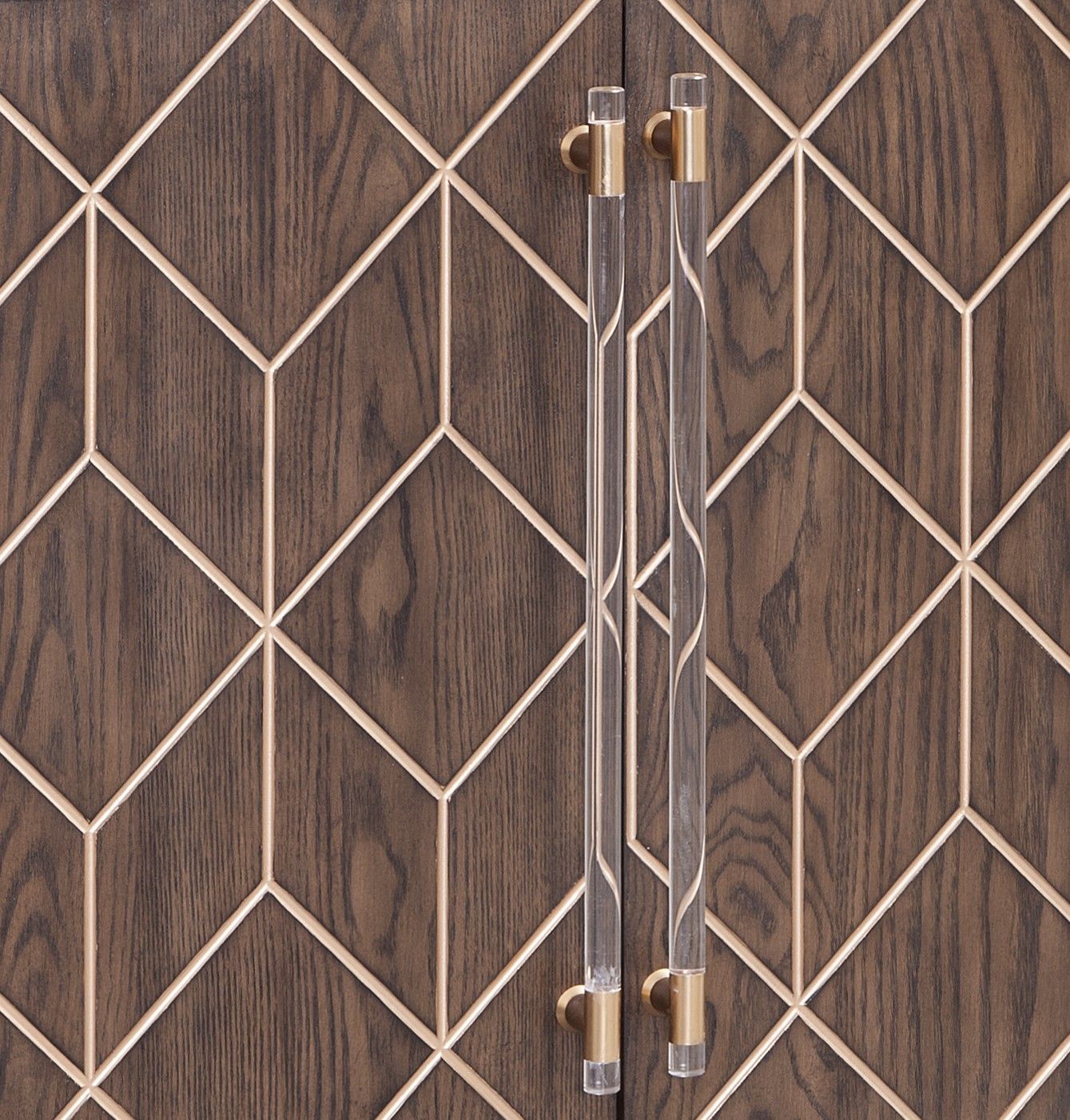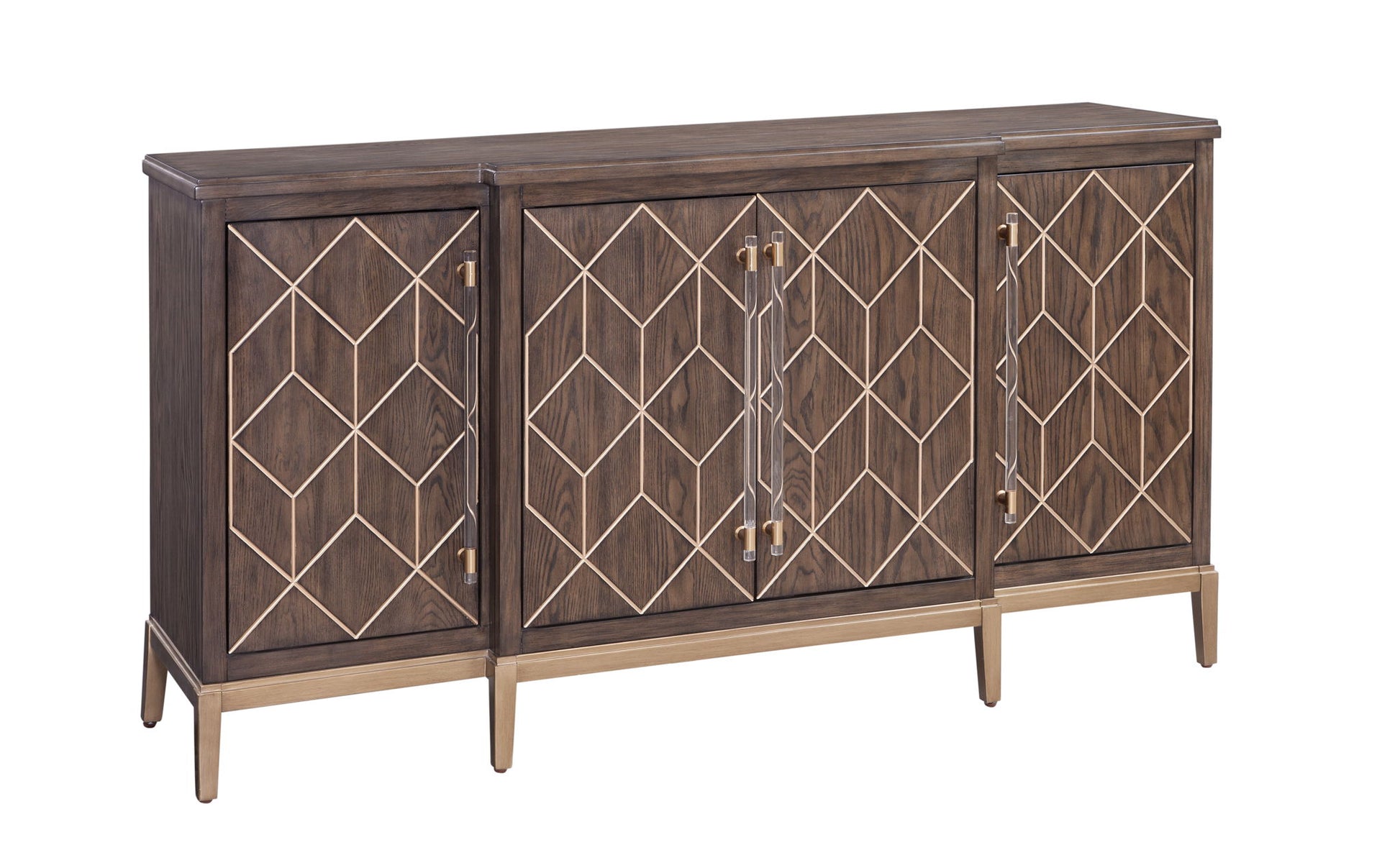 Perrine Brown Oak Server features modern glam design inspirations. The four doors feature a geometric carved design with a contrasting gold finish. The door pulls feature gold caps on the custom acrylic hardware. The case is constructed with rubberwood solids and oak veneers in a brown oak finish. The offset base features tapered legs in a contrasting gold finish. The interior features a drawer and three adjustable shelves with cutouts for media cord management.
