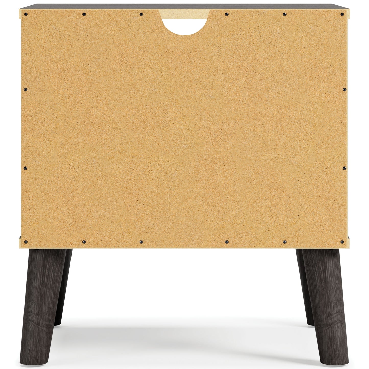 The perfect marriage of contemporary and casual style, this nightstand is a charming addition to your home. It's expressive with a two-tone look in a solid matte finish and a replicated sugarberry wood grain pattern. White knobs and splay legs add a finishing touch, while the open shelving allows for extra storage.