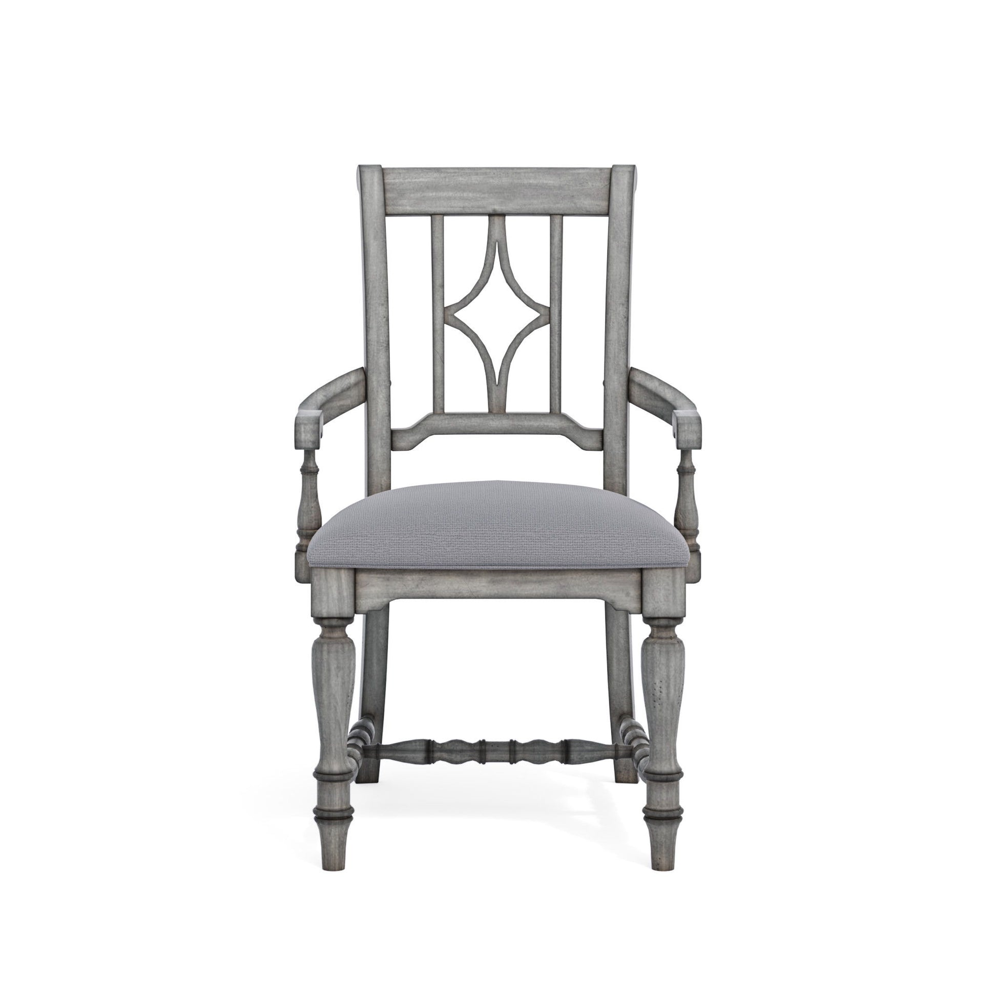 Shabby chic design with a bit of vintage. The Plymouth upholstered arm dining chair boasts a shabby chic design with an overall graywash finish. Accented by coordinating dark dining table and buffet tops, Plymouth is ideal for those who like a bit of vintage design in their modern lives. This chair features a panel back with a diamond-shaped detail, and is a perfect seating choice to complement the Plymouth rectangular dining table or round pedestal dining table.