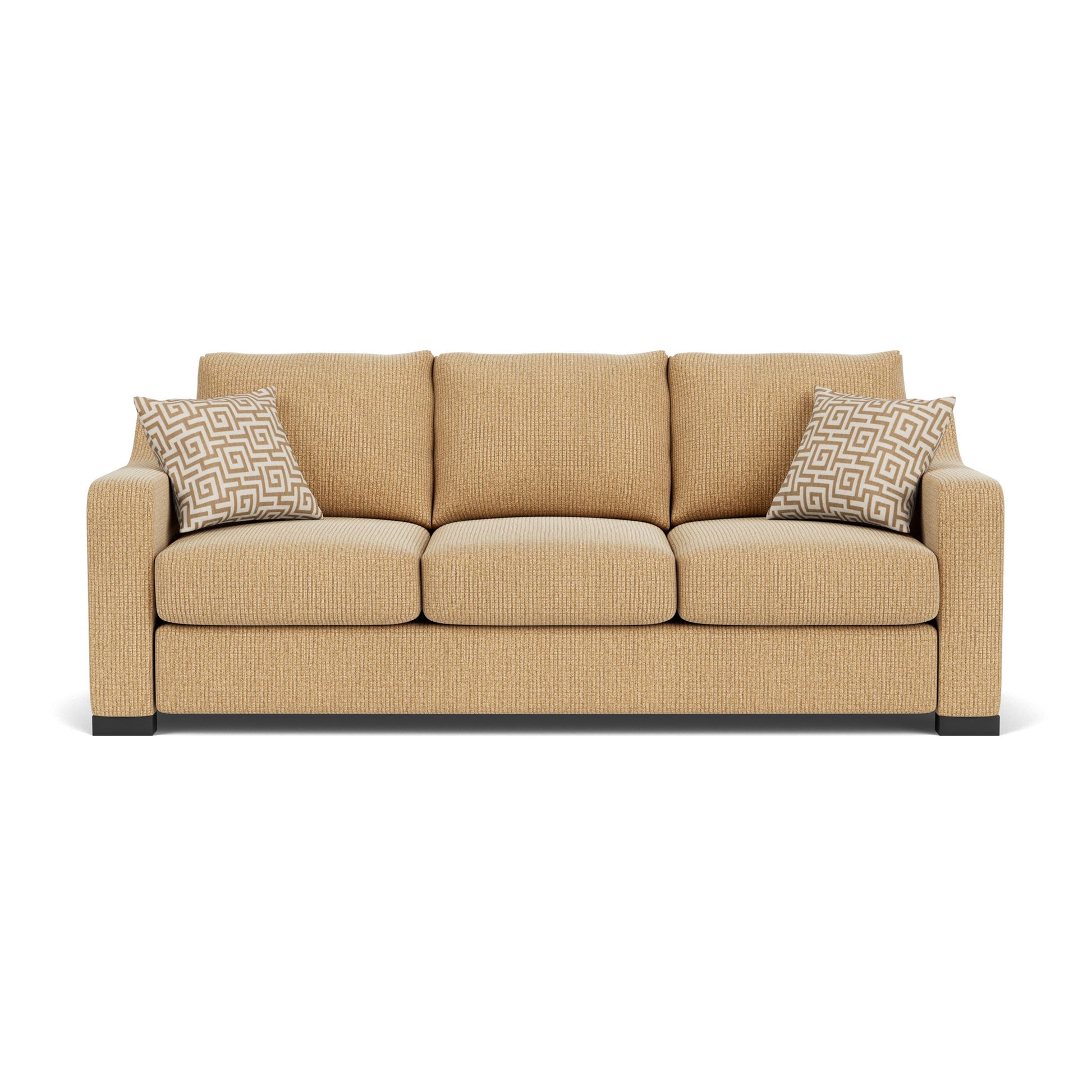 Harmonious Flair. Cozy and casual yet stylishly relevant, the Quinn sofa exudes an effortless vibe that harmonizes with any decor. Gently sloping track arms sit atop black recessed legs to make a statement. Two accent pillows add flair, while plush, sink-in cushions ensure that comfort never gets compromised. Create the perfect, relaxed look for your living space with your choice of upholstery fabrics, including performance and sustainable options.