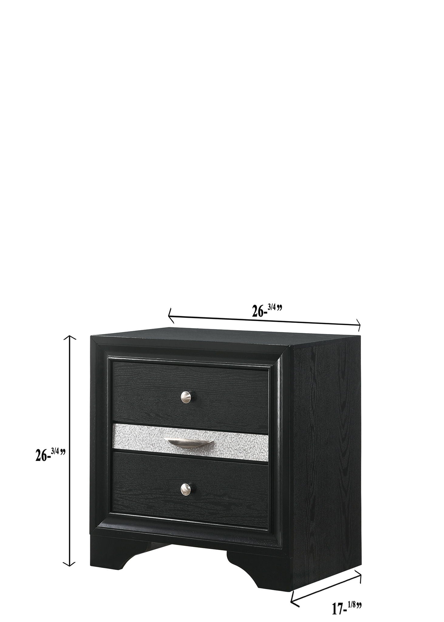 This bedroom set offers a sophisticated and cohesive look with its dark-toned wood and elegant design. The bed stands out with a high headboard featuring a shimmering silver accent, giving it a luxurious feel. The set includes a bed with storage drawers at the footboard, ideal for extra linens or out-of-season clothing, enhancing the functionality of the space. Matching pieces consist of a nightstand, chest, and a dresser with a variety of drawer sizes for optimal organization.
