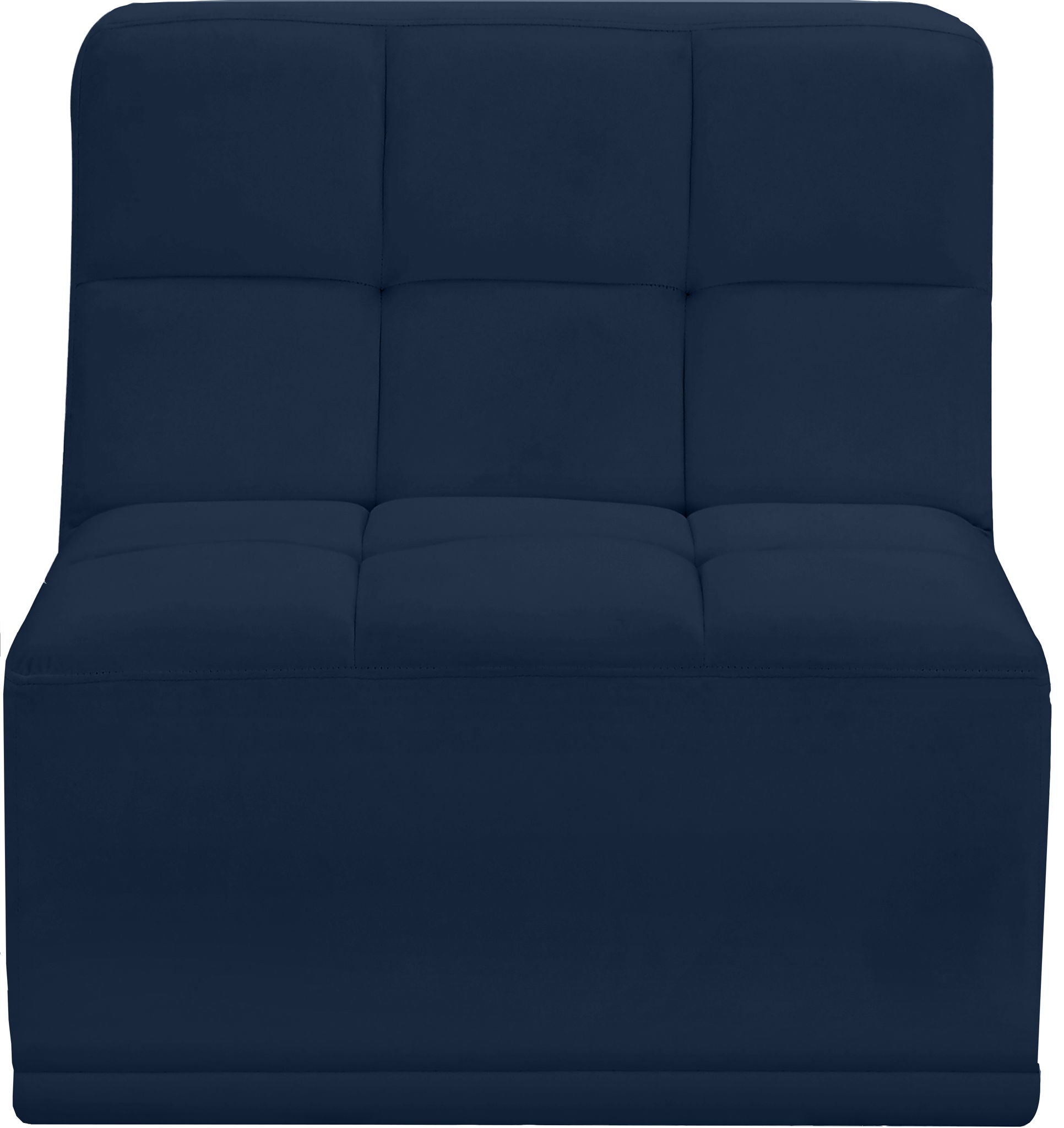 Bolster a contemporary vibe in your living room with this Relax black velvet armless chair. Soft velvet upholstery offers delicate comfort, making this chair cozy for anyone who sits in it. Biscuit tufting gives this chair texture and its lack of arms creates modern style, adding extra comfort and elegance to your living space. It s modular design allows you to create infinite configurations, making it a versatile piece to add to your home. A latch underneath the chair makes it easy to attach to other pieces.