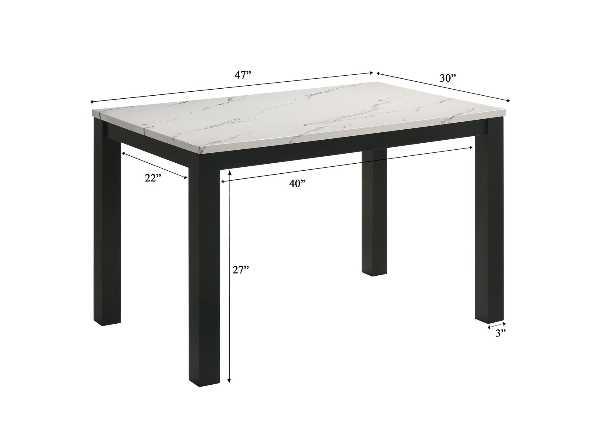 This dining group radiates modern elegance with a sleek, minimalist design that's both stylish and practical. The centerpiece is a contemporary table featuring a sophisticated faux-marble top that elevates the aesthetic while providing a durable and easy-to-clean surface. Surrounding the table are four plush, upholstered chairs in a rich charcoal fabric, offering comfort and understated luxury. The chairs' sleek legs create a cohesive and polished look that complements the table's frame. Perfect for small dining spaces or breakfast nooks, this set brings a chic, upscale vibe to any room without sacrificing functionality.