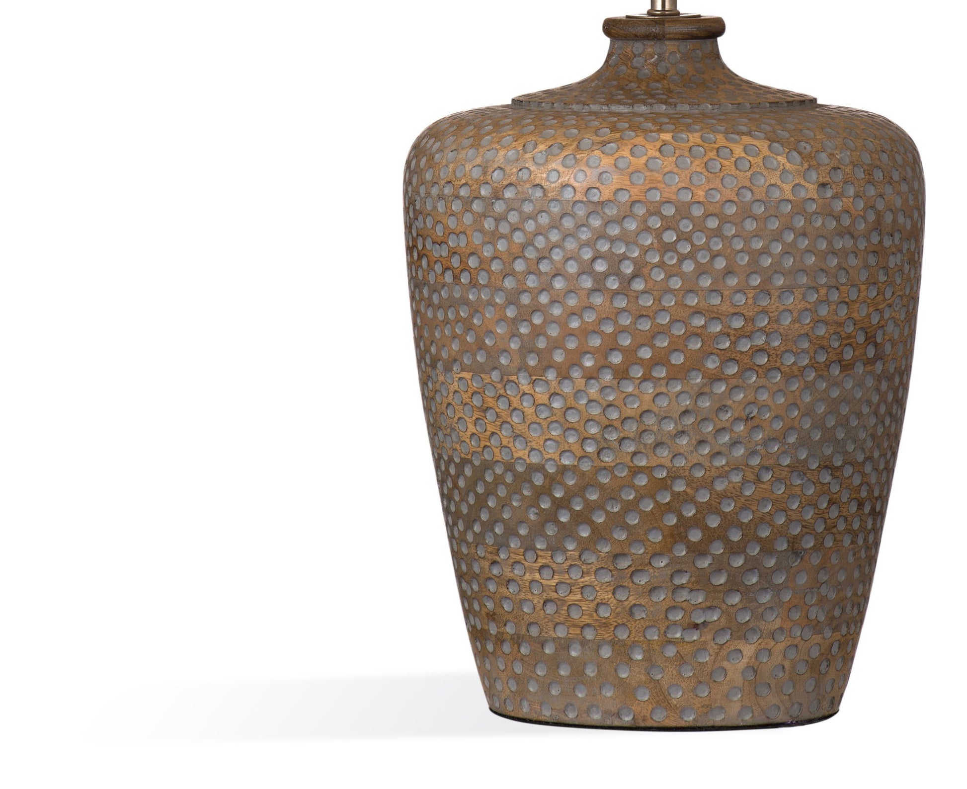 Rison Table Lamp is crafted of mango wood with carved circle impressions, a drum shade and a natural wood finish with brown and gray highlights.