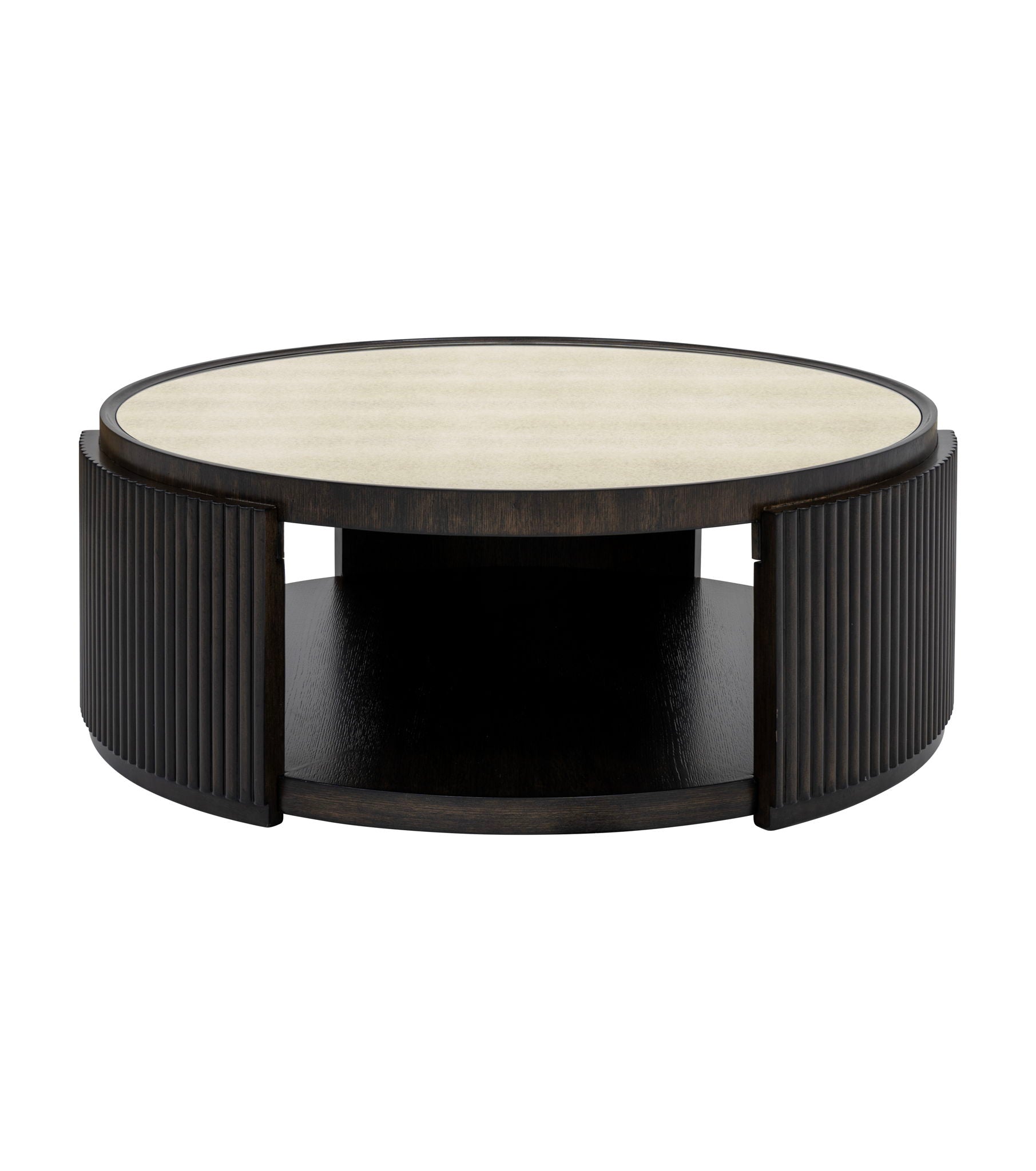 - Round open-frame design with reeded detailing in charcoal oak