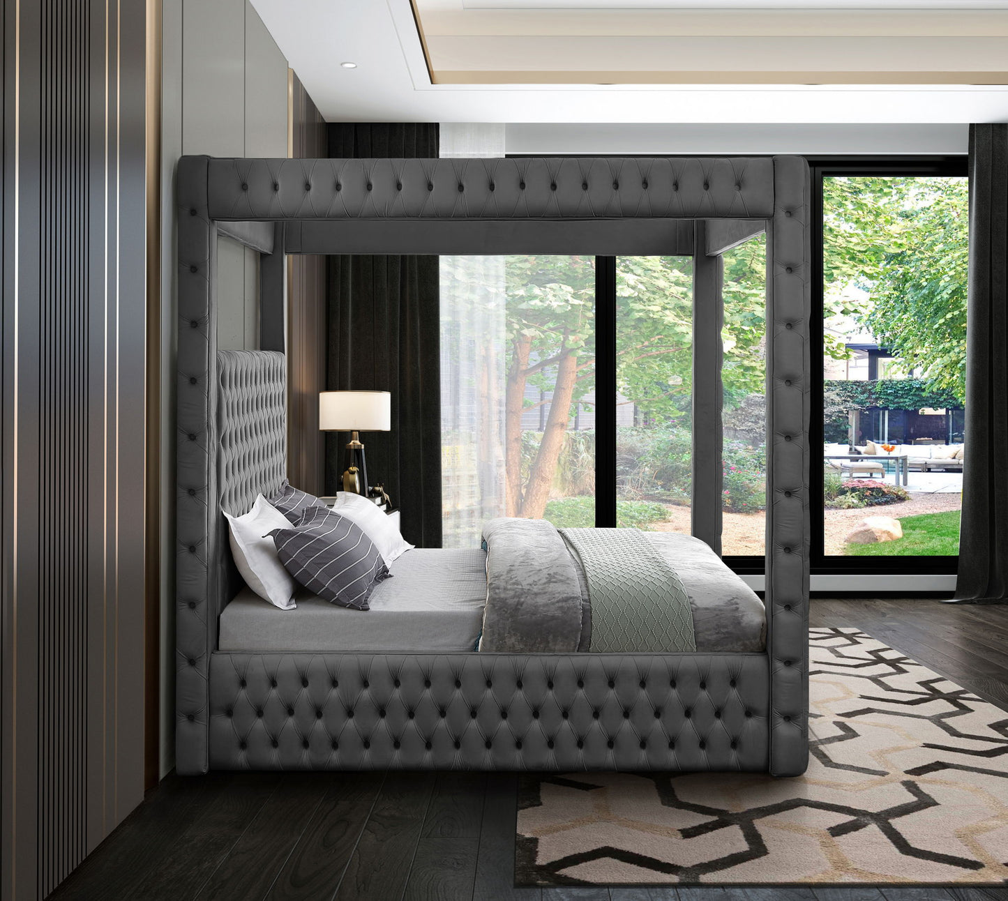 Create a bedroom sanctuary you never want to leave with this Royal velvet bed at its center. Stunningly crafted, the Royal bed features a canopy that towers over the top of the bed for a modish take on a timelessly affluent design. Deep tufting adds a textural look while the soft velvet upholstery shores up the bed's sophisticated design.