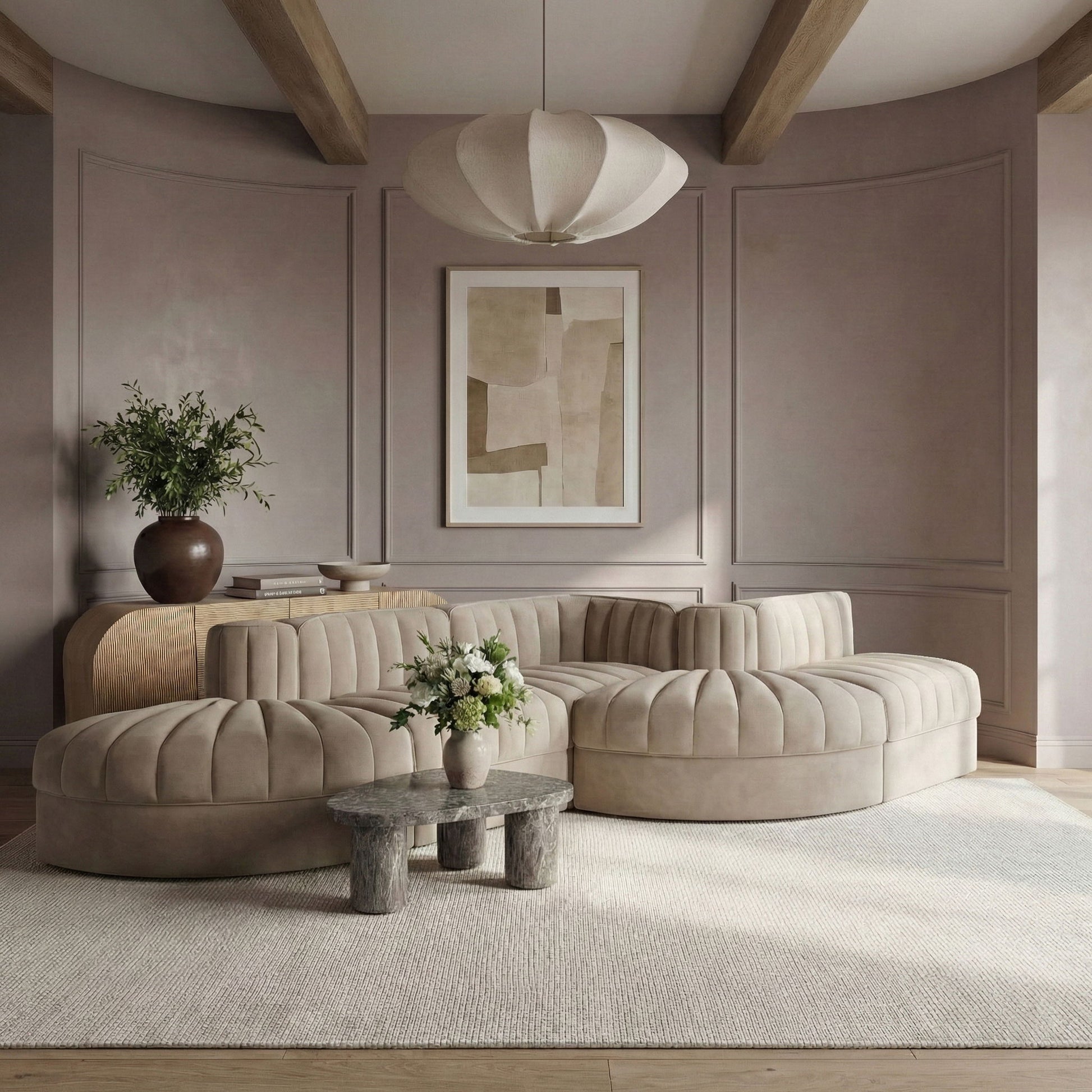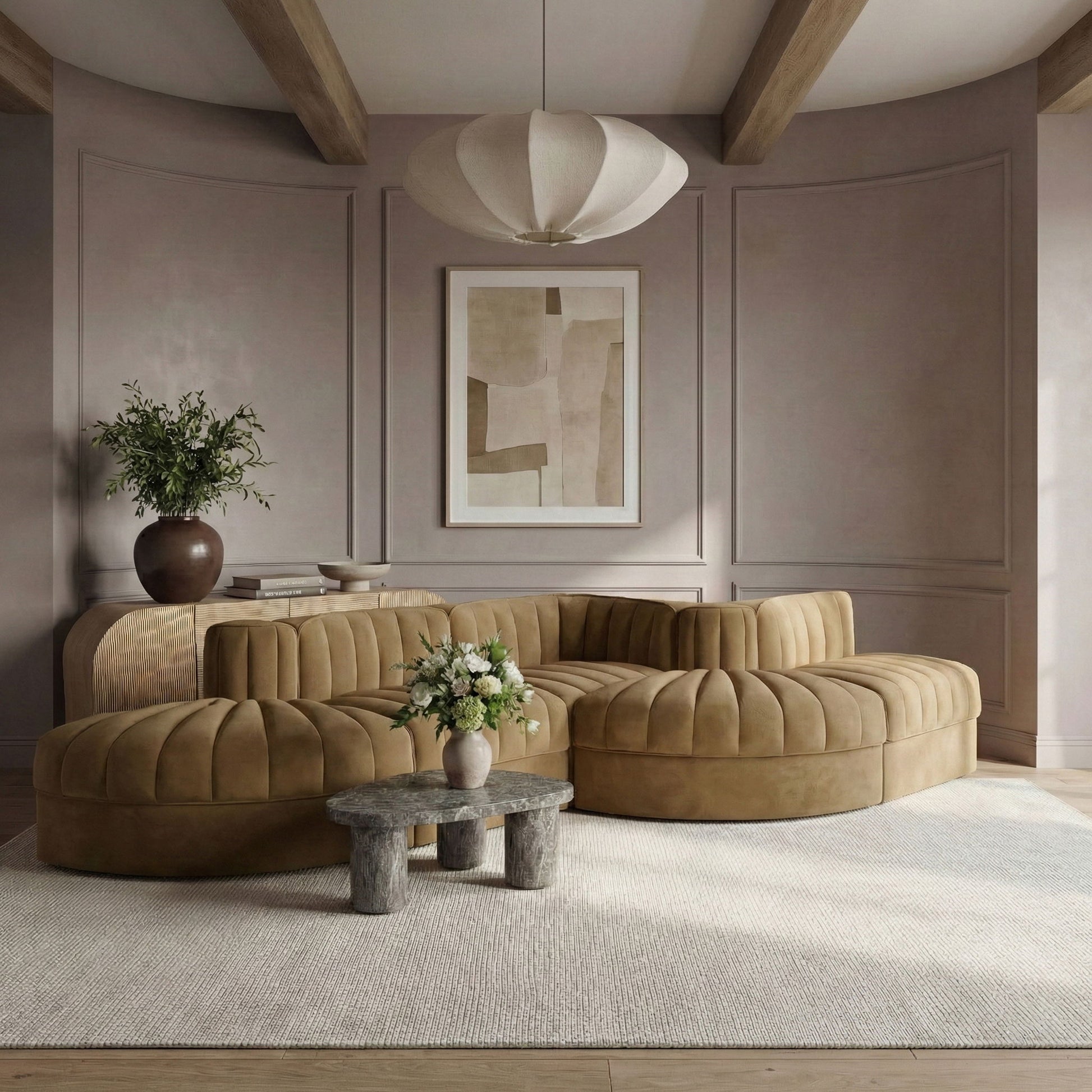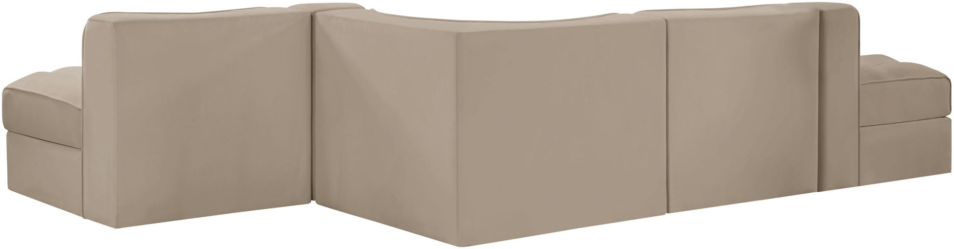 Rummi - Rounded Velvet Performance Fabric Upholstered 5 Piece Modular Sectional - Beige