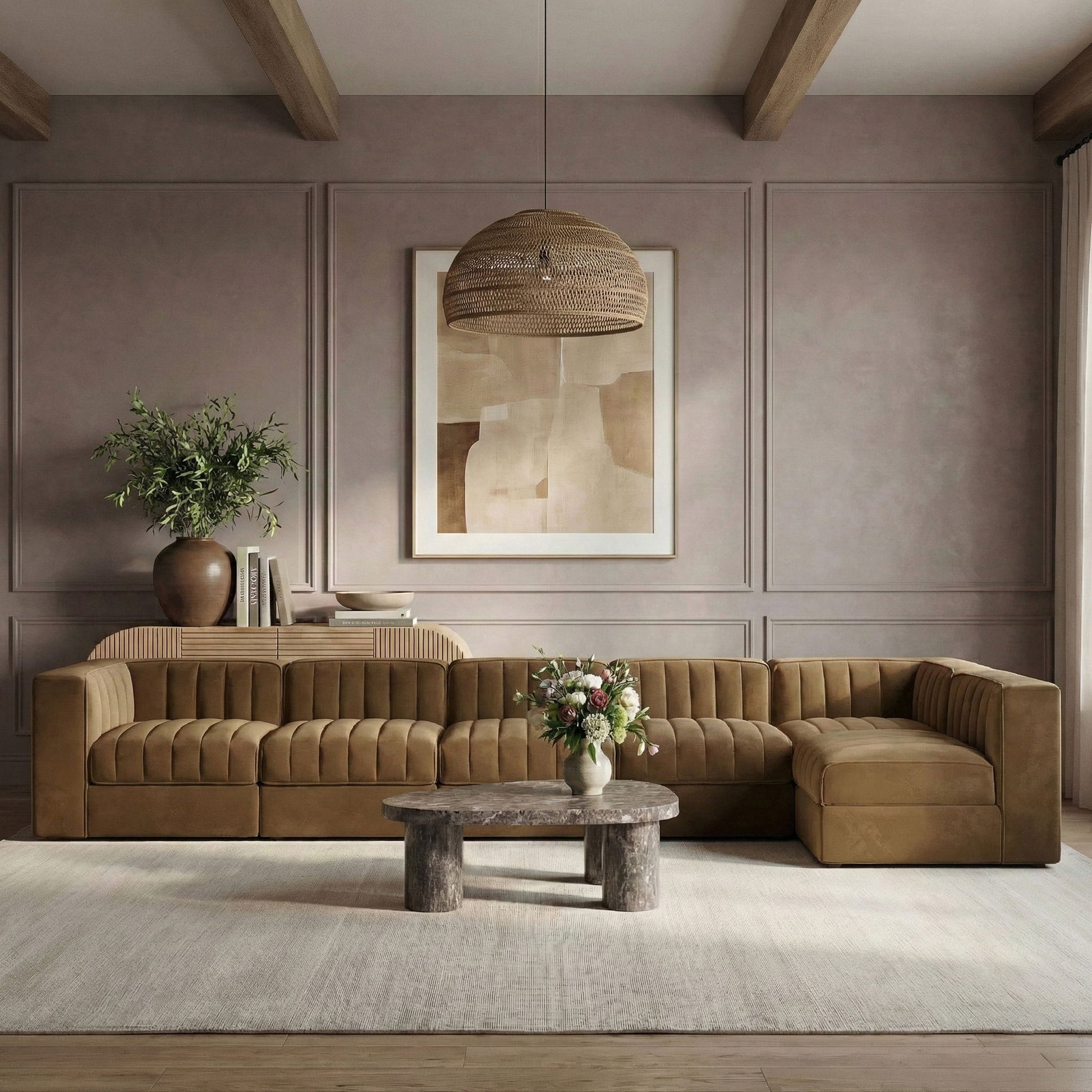 Rummi - Velvet Performance Fabric Upholstered 6 Piece Modular Sectional, L-Shaped (Right) - Saddle