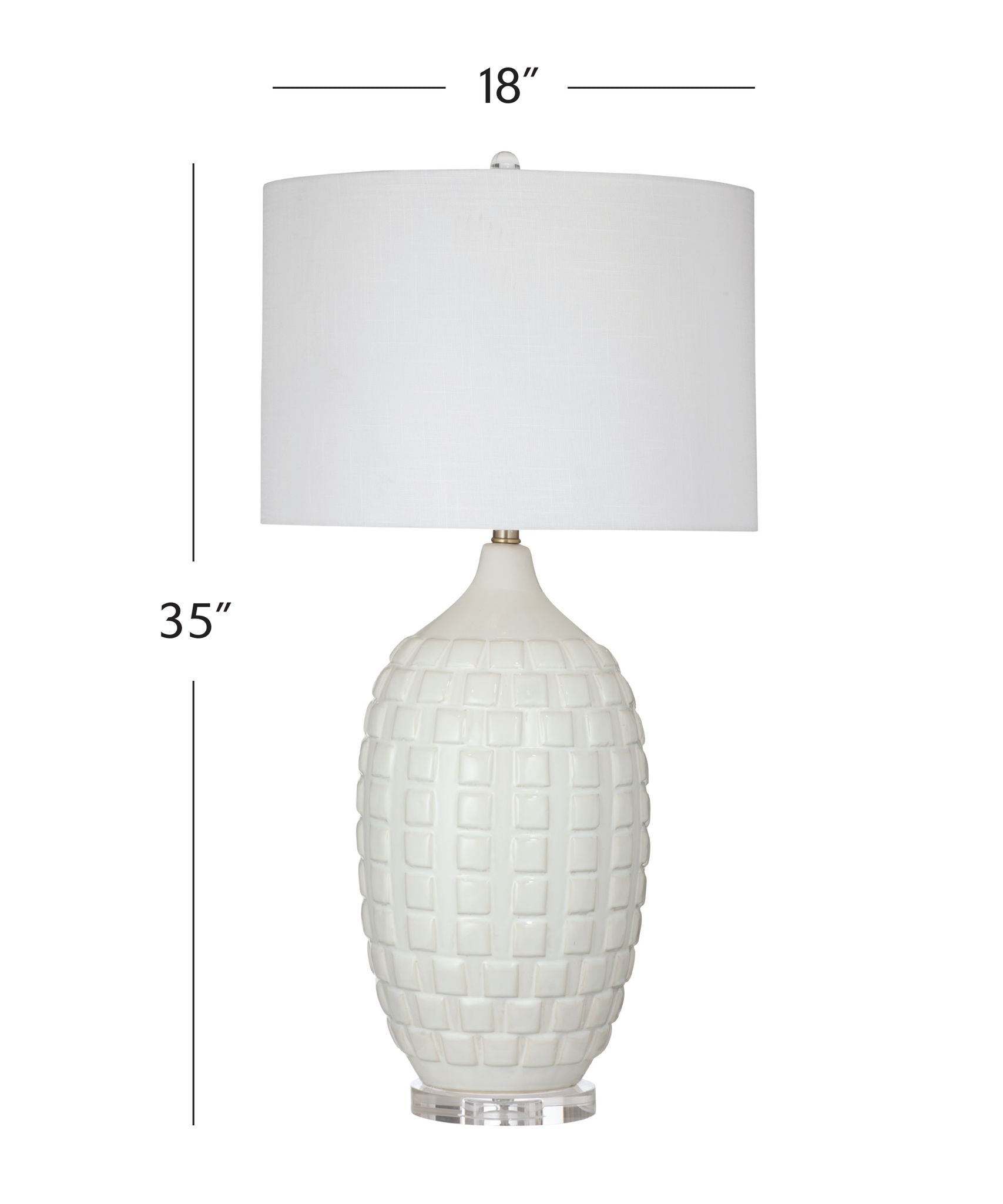 The Sesser Table Lamp features a sleek white ceramic base with a square stamped pattern, adding a stylish touch to any space. The contemporary design is complemented by an acrylic support base that provides stability while enhancing the lamp's modern appeal. The white drum shade softens the light, creating a warm and inviting atmosphere perfect for living rooms, bedrooms, or offices. With its clean lines and elegant details, the Sesser Table Lamp seamlessly fits into a variety of interior styles, bringing both form and function to your home.