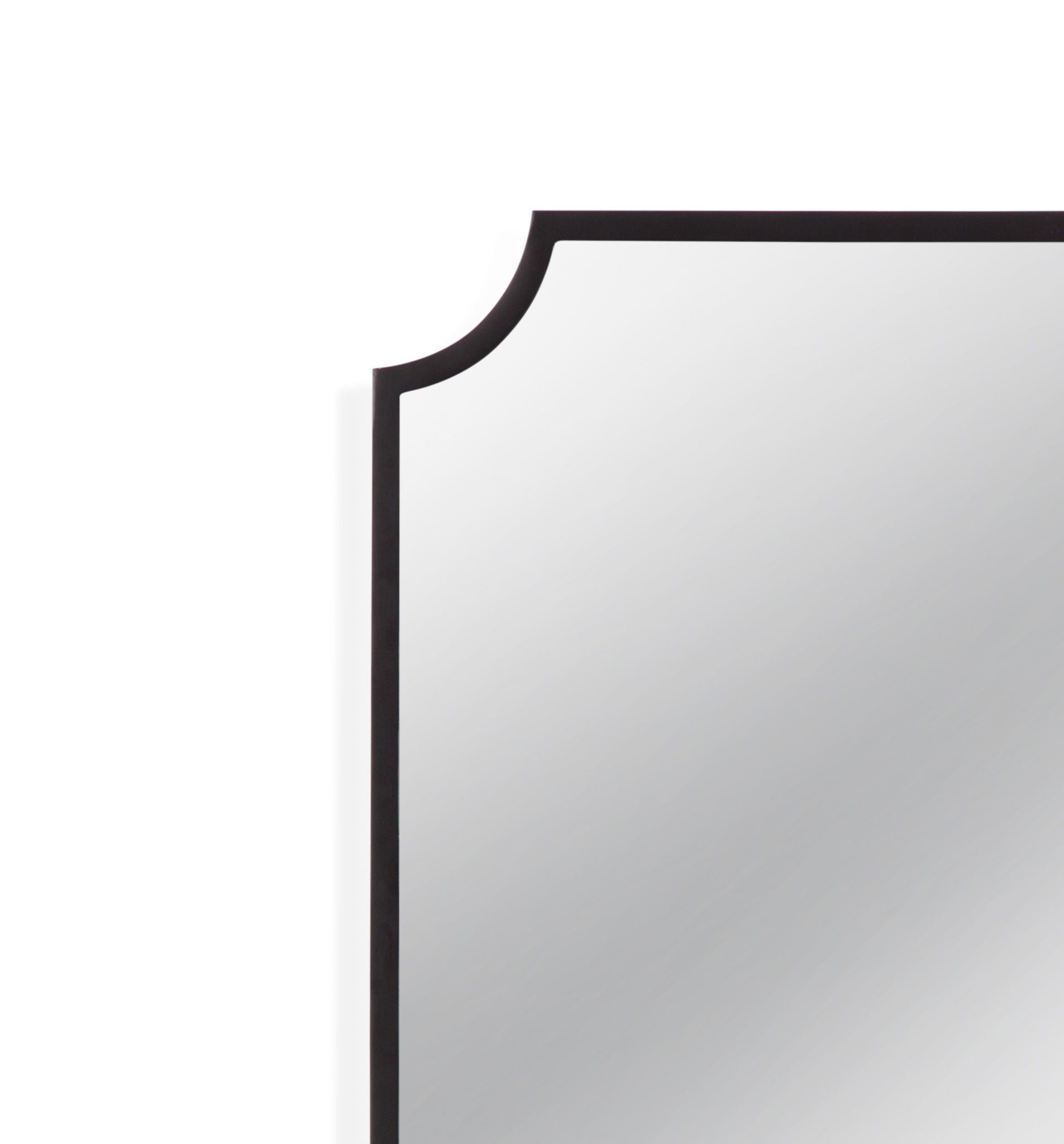 The Sheldon Wall Mirror is a long rectangle with a concave details on the top corners. The mirror frame is finished in a blac mango wood. Includes two "D" ring attachment points for ease of access for hanging. The hand crafted details produced by a skilled artist lends itself to a unique technique and will vary slightly.