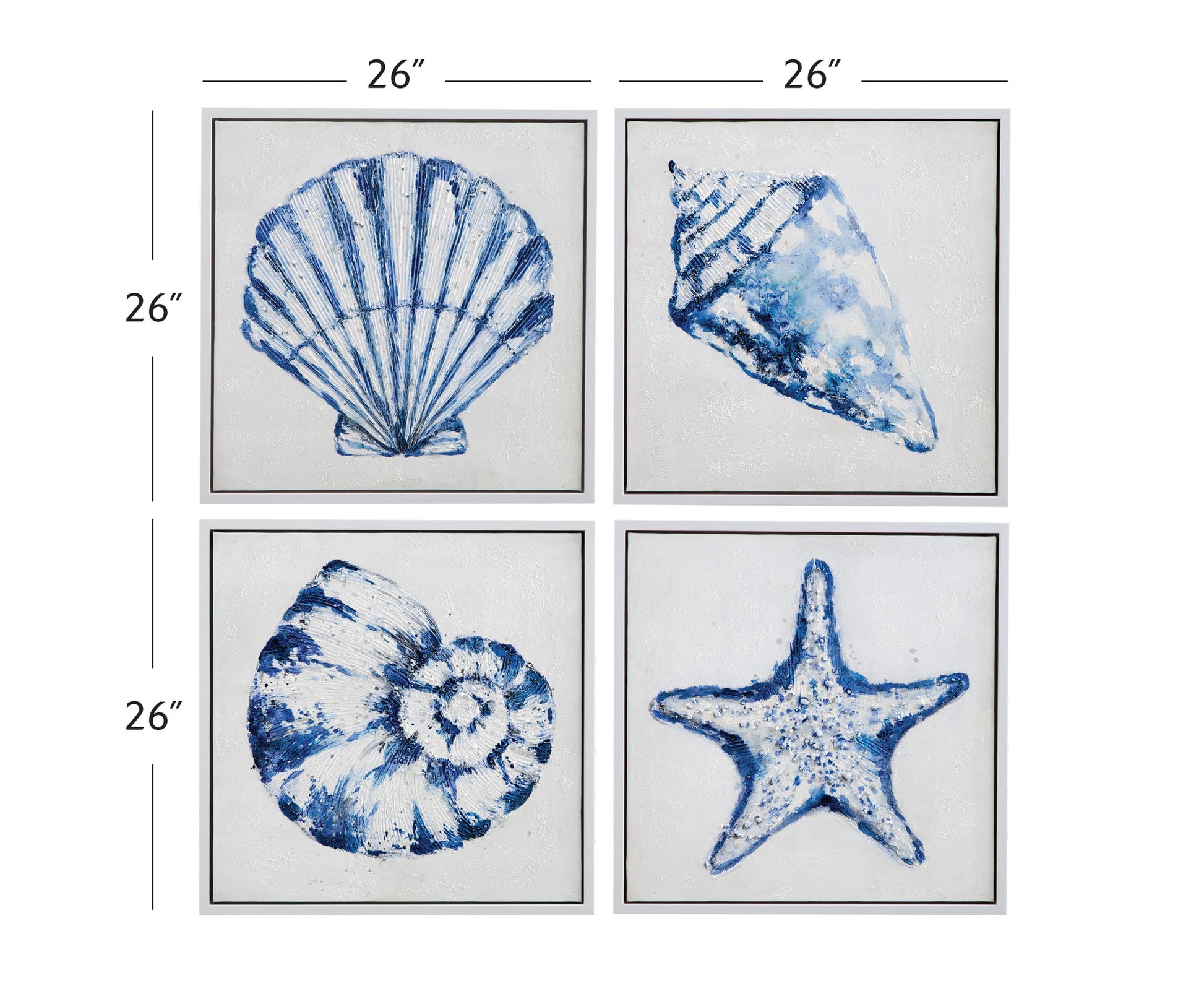 The Shells Framed Canvas set of four features a beautiful coastal design with soft white and blue hues, evoking the serene beauty of the ocean. Each canvas captures the essence of coastal living, making it the perfect addition to any space that embraces a beach-inspired aesthetic. Framed in sleek white, these pieces enhance your decor with a clean, modern look. Whether hung in a living room, bedroom, or hallway, the Shells Framed Canvas set brings a fresh, calming atmosphere to your home.