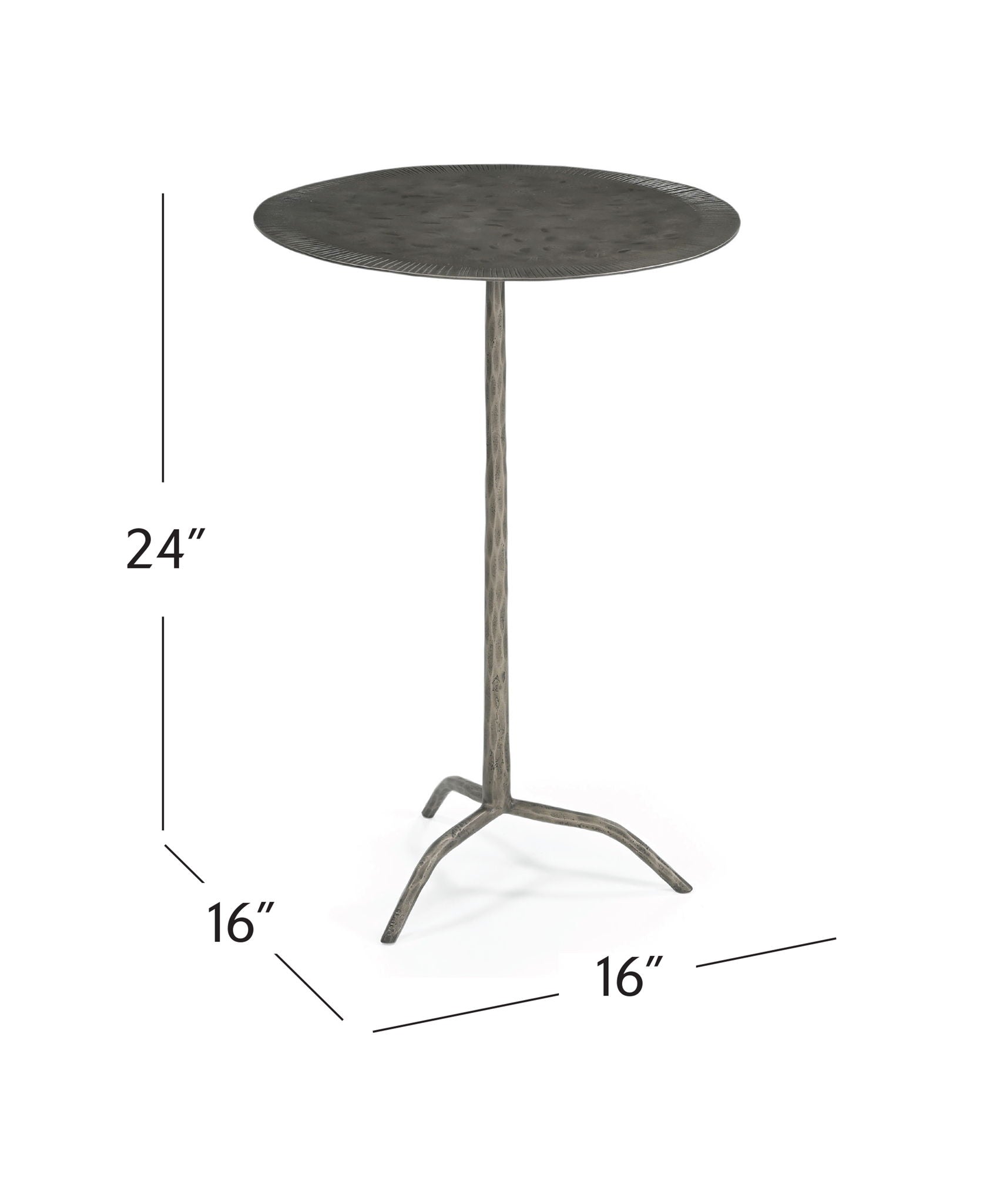 The Silas accent table is the perfect modern addition to any space, offering both functionality and style. Crafted from hammered iron with an antique nickel finish, its unique three-legged design adds character to your decor. The hammered metal construction not only ensures durability but also brings a touch of artisanal charm to your home.