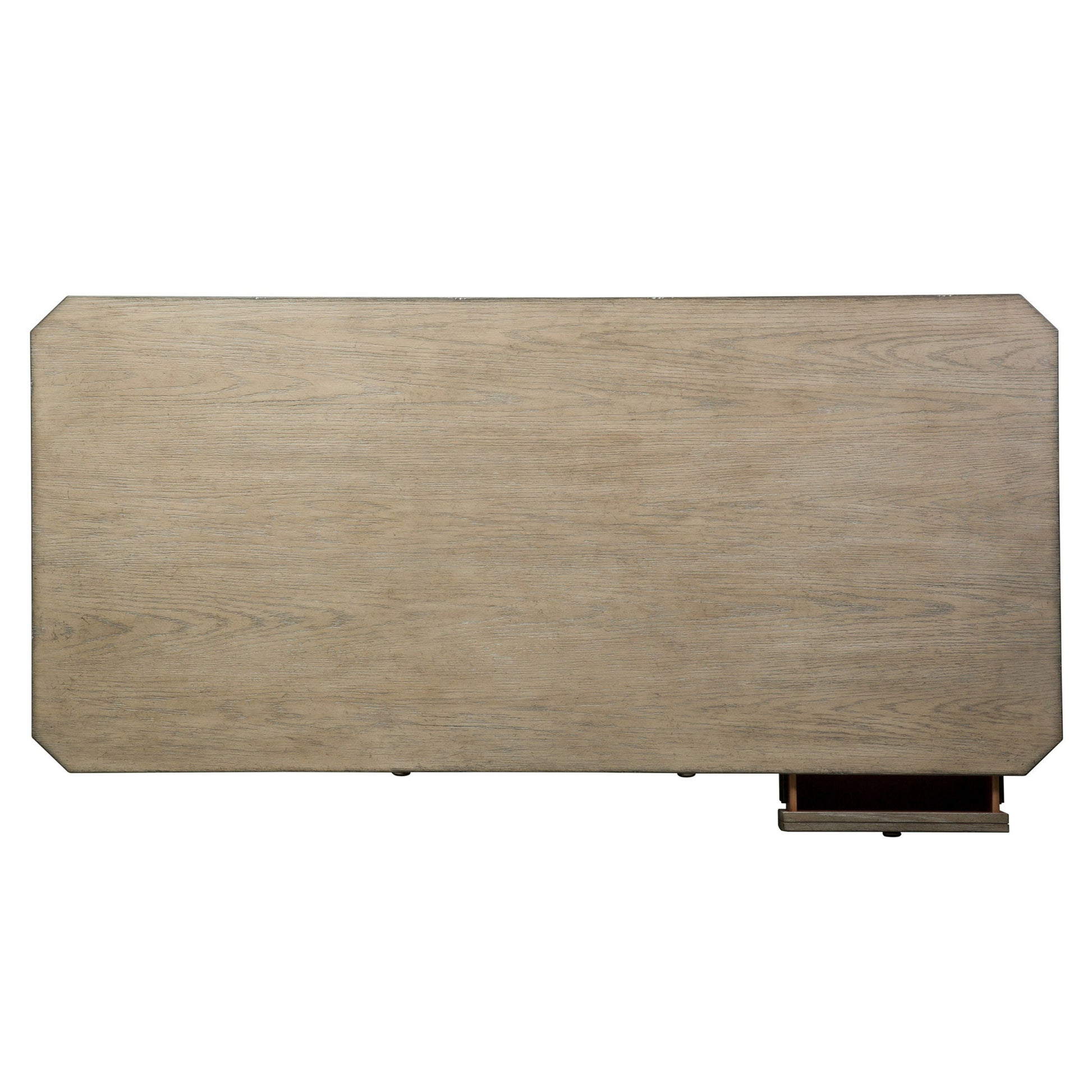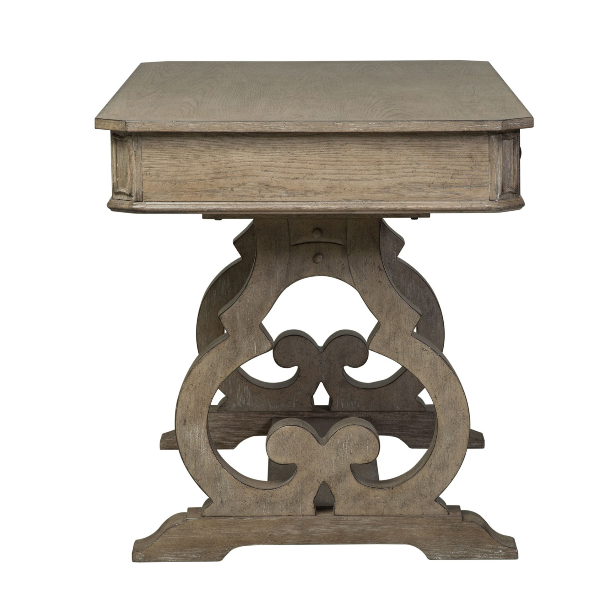 Work from home or the office in comfort and style with the Simply Elegant writing desk. Crafted of rubberwood solids and cathedral white oak veneers, this piece features a heathered taupe finish and is accented with antique brass knob hardware. The desk features three full extension wood framed drawers including a center drawer with a flip down keyboard tray, and is anchored by beautiful scrolled legs. The Simply Elegant collection creates an inviting combination of casual styling and elegant ambiance.