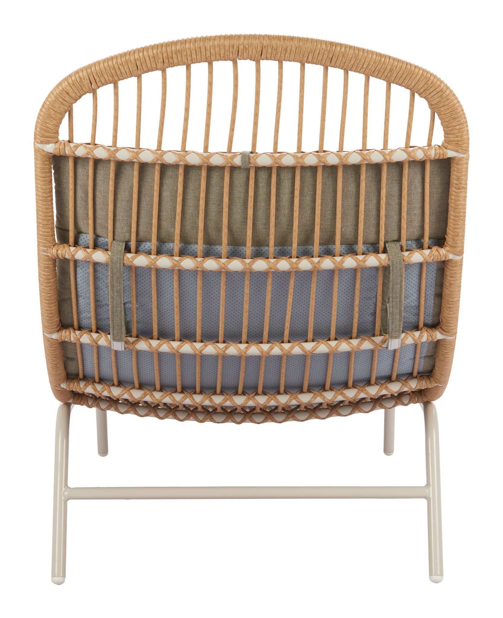 A statement of refined design perfect for hospitality spaces, the Skim Lounge Chair Multicolor combines multicolor shades with high-quality outdoor fabric (100% olefin), powder coated aluminum, and synthetic rattan weave (100% polyethylene), making it a stylish yet practical choice.