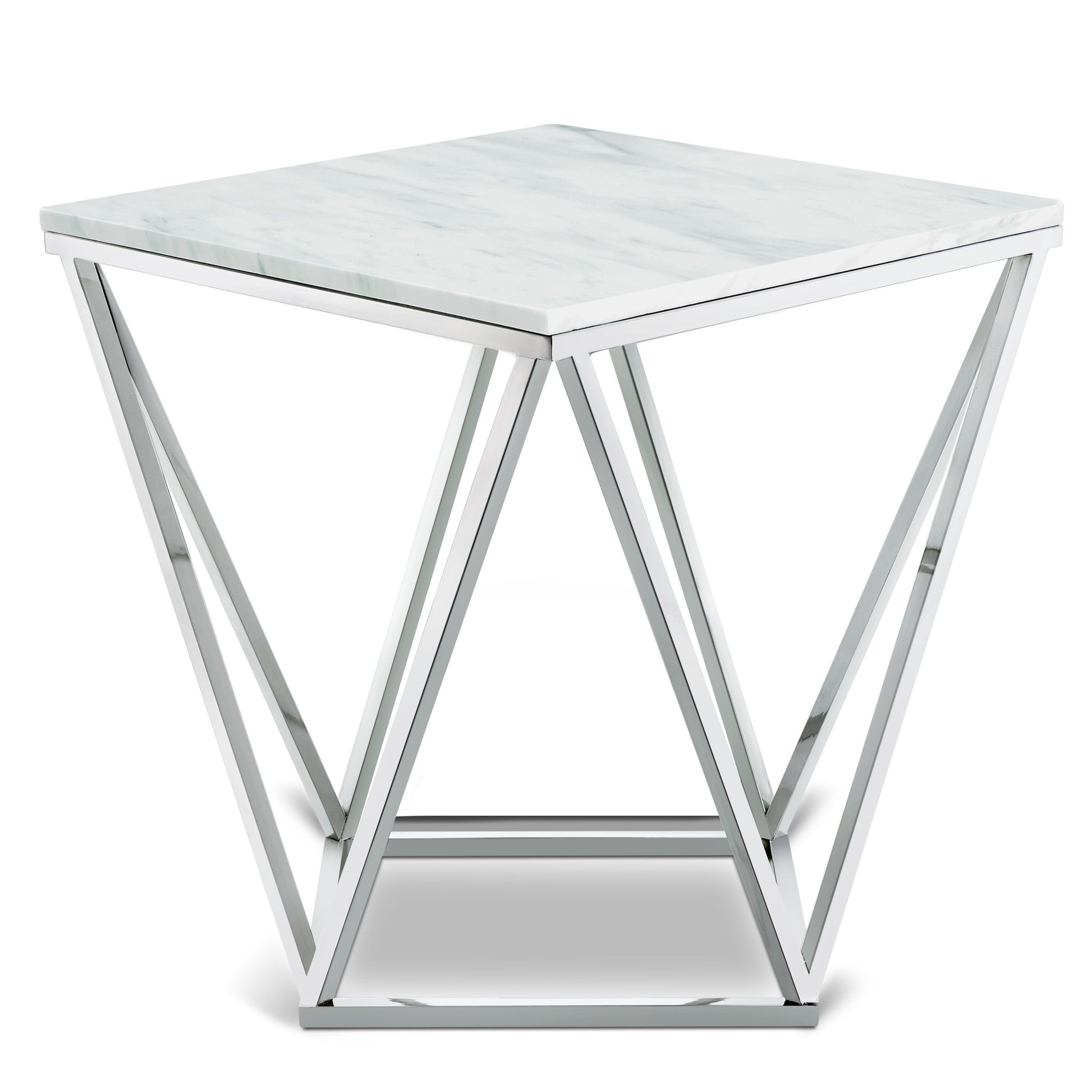 Keep the modern vibe going with this Skyler stainless steel end table from Meridian Furniture. This end table features architectural bases with a sculptural design that's chic and contemporary. The top of the table features Genuine Marble Top for durability and remarkable style.