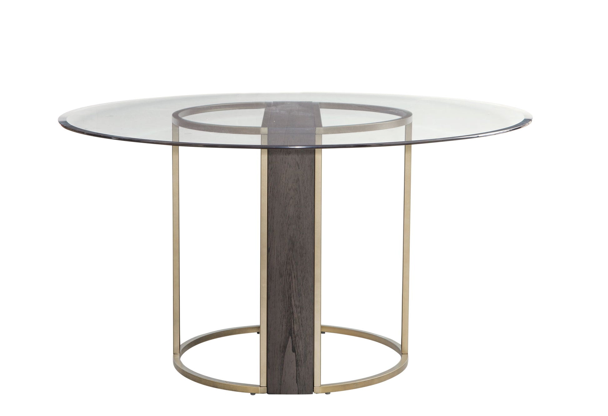 The Stefan Dining Table features a Mid-Century Modern inspired design combining a champagne metal frame and mindi veneers in a chalk gray stain. Accommodates up to a 54" glass top. Finish: champagne, chalk gray stain. Material: metal, rubberwood solids and mindi veneers. Uses up to a 54 inch glass top and can comfortably seat 4.