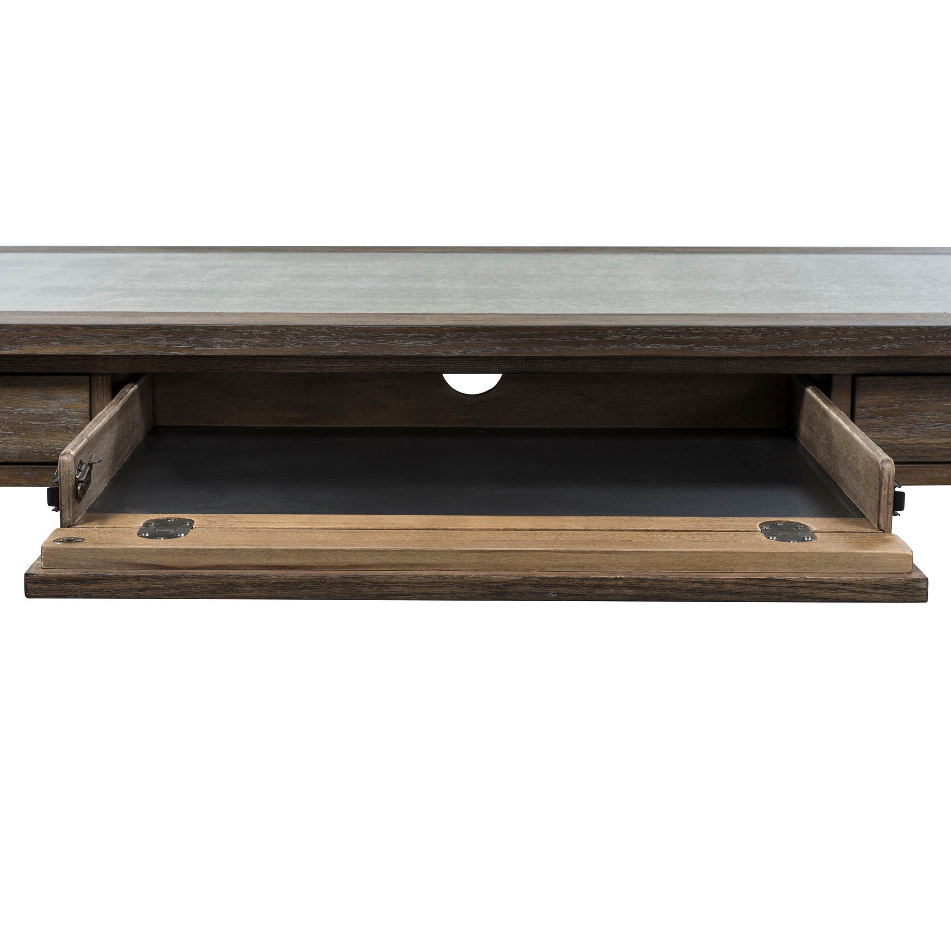 Create a look all your own with the Stone Brook laptop desk. Crafted of acacia and poplar solids with white oak veneers, this piece features a weathered gray finish. This desk has three full extension drawers that are accented with recessed pulls in an antique pewter finish. The center drawer includes a flip-down keyboard tray. Wow family and friends with the concrete composite inset top that flow into an angled leg design. Mixed materials of the concrete with the saddle finish give Stone Brook a modern rustic feel.