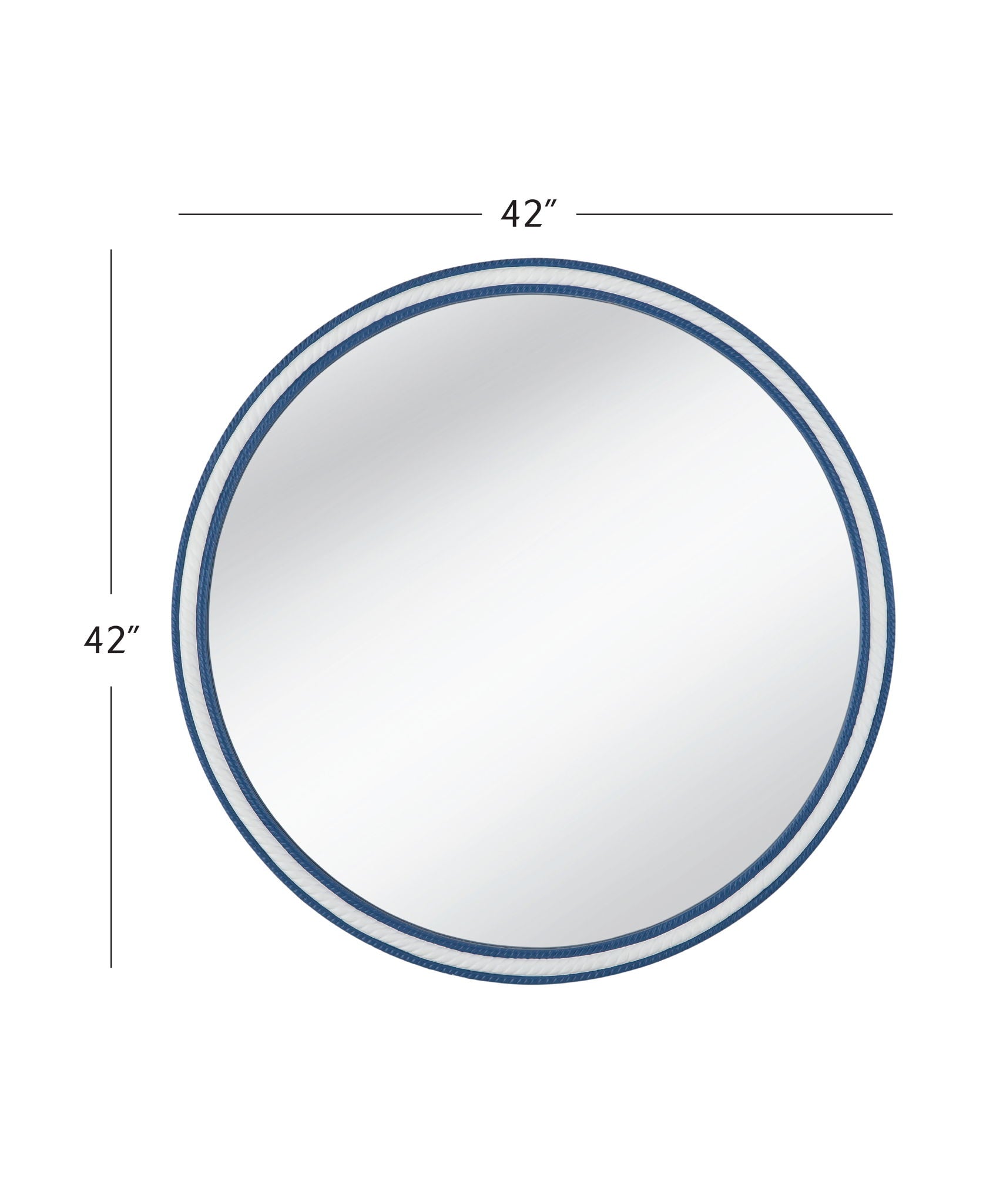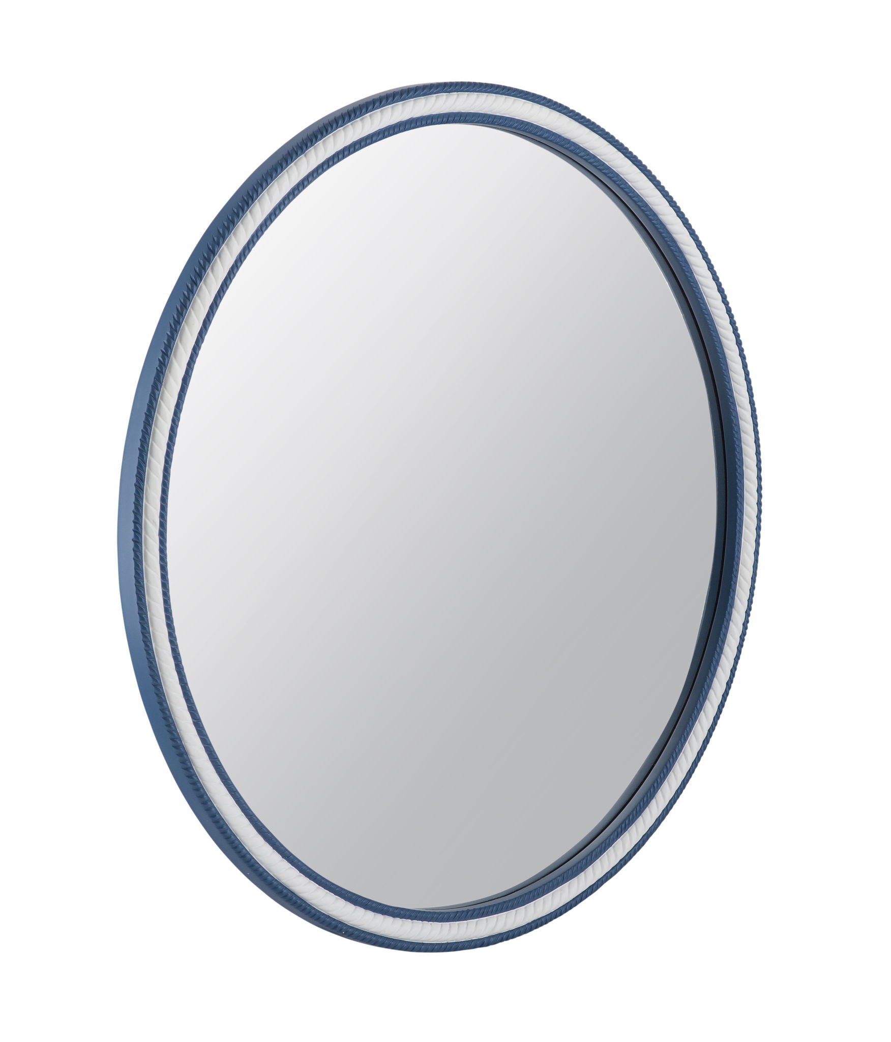 The Straits Wall Mirror boasts a round frame adorned with a charming rope motif, finished in a refreshing blend of bright blue and white resin. Its modern coastal design adds a touch of seaside charm to any space, creating a welcoming atmosphere with its cheerful hues and timeless aesthetic.