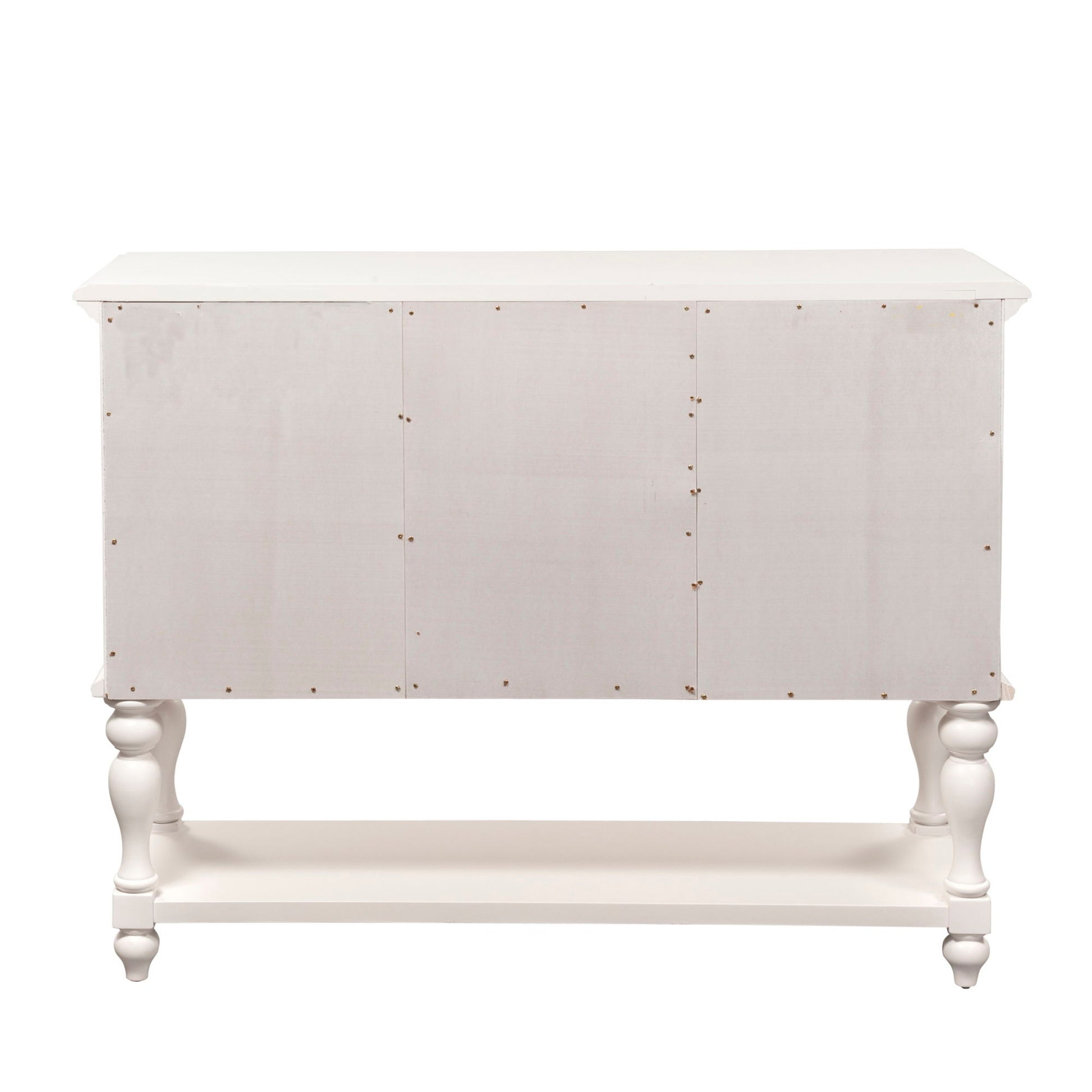 Invite cottage design into your dining room with the Summer House server. Crafted of poplar and rubberwood solids, this piece features a dove grey finish, full extension drawer glides for easy access to storage, fancy louvered panel accents on the two doors, bead molding framing on the drawers and doors, one adjustable shelf behind each door for user customization, three drawers, a felt lined silverware tray, wooden knob hardware, and is accented by beautifully round turned legs. Users can enjoy the added storage and convenience added by the bottom shelf, perfect to display items. This piece is available in an alternate finish, sure to be great addition in any space.