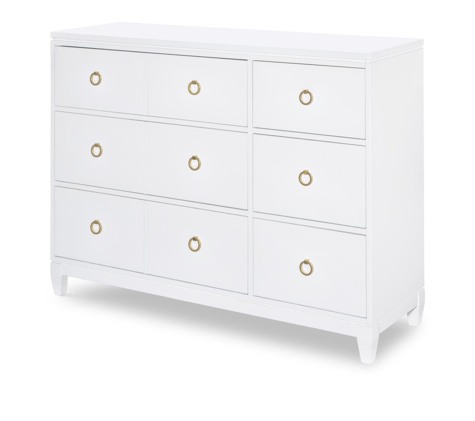 Elements such as floating tops,, tapered feet,, flat drawer fronts,, and simple shapes lend the perfect backdrop for easily creating a beautifully styled space. The pieces and scale of Summerland allows multiple options for a modern,, livable style. Gold ring pull hardware adds a high-end touch.